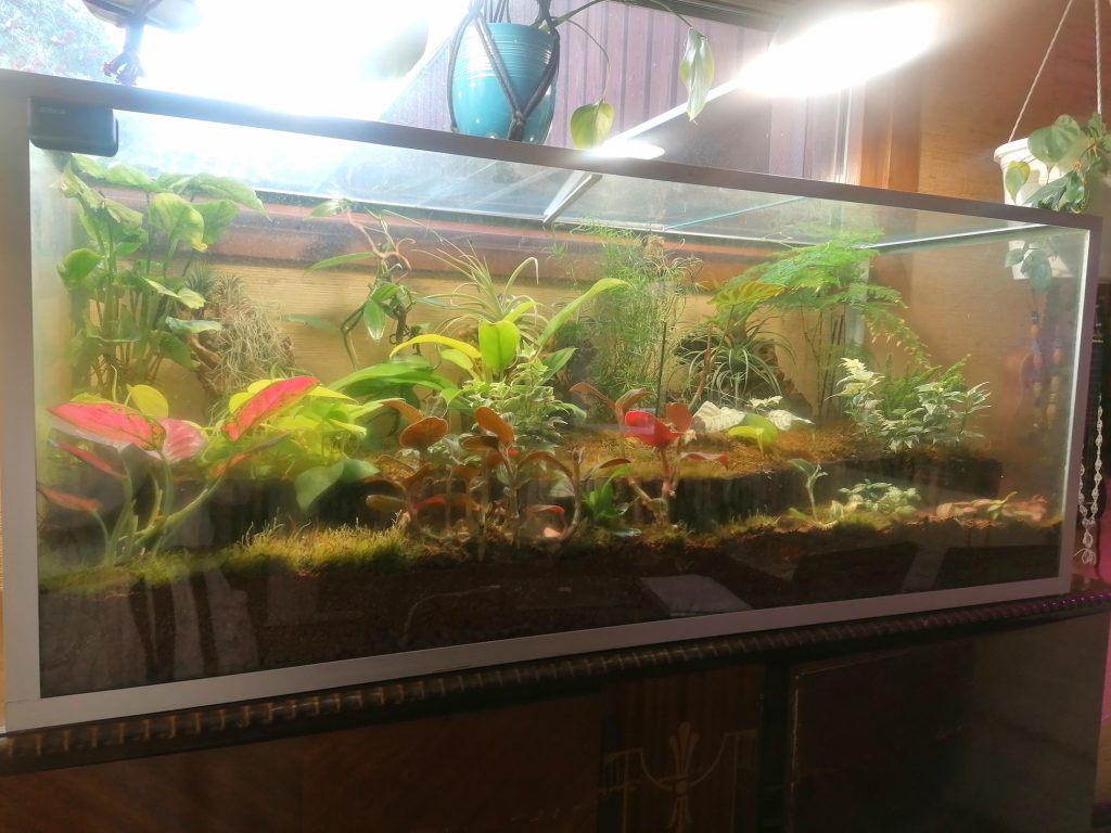 Omistan yhden suljetun kasviterraarion, jonne olen laittanut monet korkeaa ilmankosteutta vaativat kasvit. Terrassa ovat viihtyneet esimerkiksi saniainen, muratti, pitsilehdet, maaorkideat, Philodendron Verrucosum, vaniljaorkidea ja monet ilmakasvit. Terraario on erittäin helppohoitoinen. Tuuletan sitä muistaessa silloin tällöin ja noin kerran kuussa annan kasveille hieman lannoitevettä. Muuta hoitoa terraario ei tarvitse.