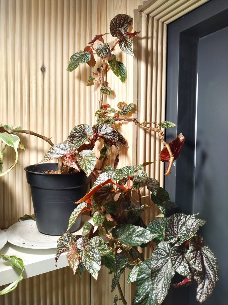Olen myynyt monta begoniaani pois ja minulla on enää vain muutama begonia: Pink Polka Dot, pikkuenkelinsiipi ja enkelinsiipi. Niillä kaikilla on vahva juuristo, joka valtaa purkin melko nopeasti. Nyt ihmettelin kun Pink Polka Dotia kastellessa vesi hulahti läpi aluslautaselle. Kasvia sai muutenkin olla yhtenään kastelemassa, kun se nuupotti vähän väliä. Lisäksi kasvi oli herkkä kaatuilemaan pienessä ruukussansa.