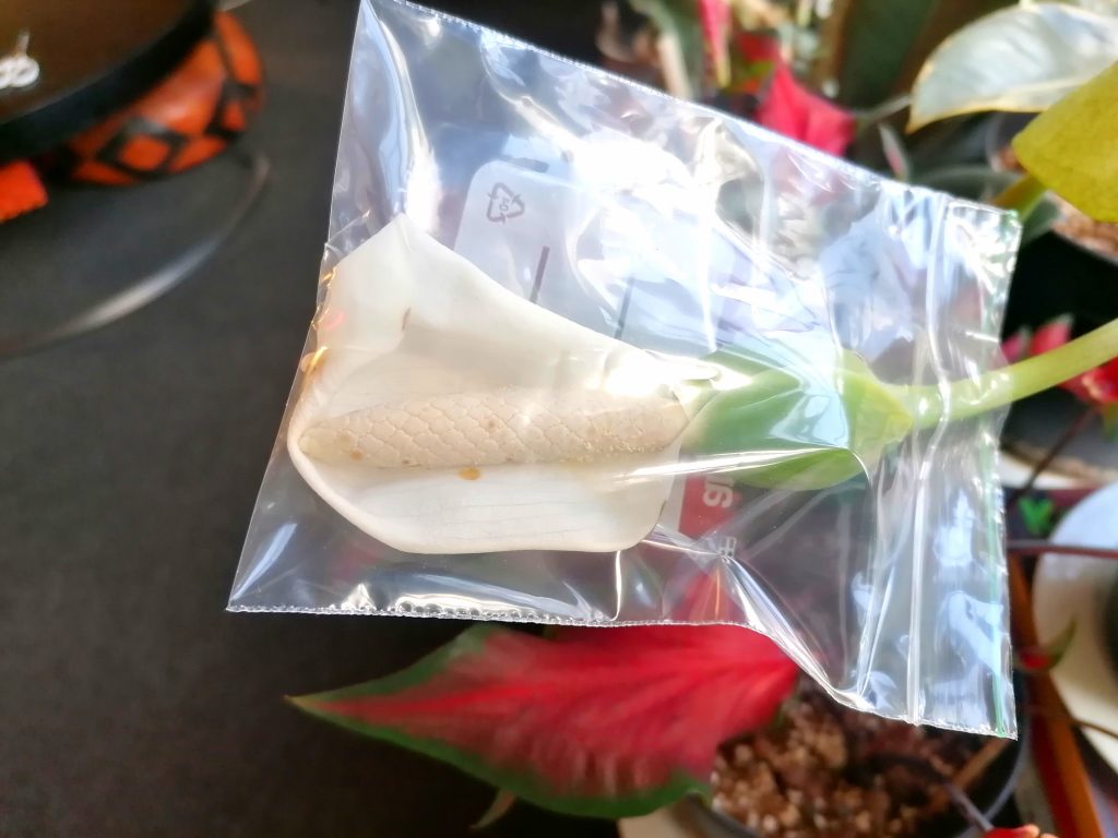 2 lajiketta (Red Ruffle ja Mint Julep) aloittivat kukinnan. Halusinkin yrittää risteyttää ne keskenään. Kun kukat alkoivat tuottaa siitepölyä, sujautin molemmista kasveista kukat samaan minigrip- pussiin ja annoin niiden olla pussissa muutaman päivän. Muut kukat olen leikannut pois, kun niitä on noussut. Sanotaan, että kukinto veisi energiaa kasvin kasvulta. Itselläni ei ole tästä kokemusta, mutta koska caladiumin kukka on melko vaatimaton, napsaisen kukat pois varmuuden vuoksi. Siemenen kehittyminen tietääkseni kestää caladiumilla kaksi kuukautta, joten aika näyttää, onnistuinko risteyttämisessä.