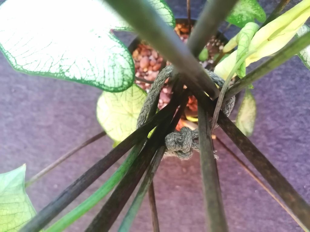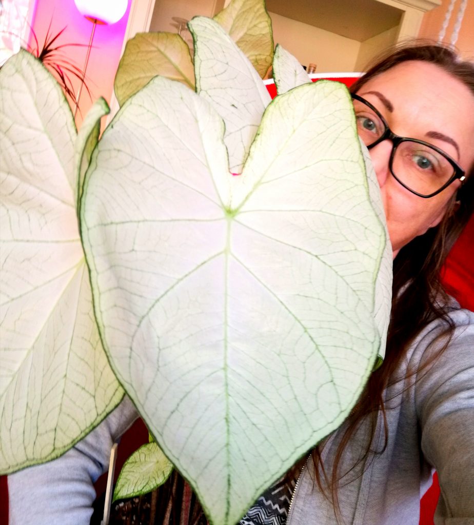 Suurimmat lehdet on tehnyt valkolehtinen Florida Moonlight- lajike, jonka suurin lehti on 35cm pitkä. Lehtivarret ovat melko rennot, joten sidoin varret nipuksi pehmeällä langalla, jotta varret eivät notku lehtien painosta. Luonnossa joillain lajikkeilla lehdistä voi tulla yli puolimetriä pitkiä ja ne voivat kurotella jopa puolentoista metrin korkeuteen. Ruukussa caladium jää yleensä pienemmäksi.