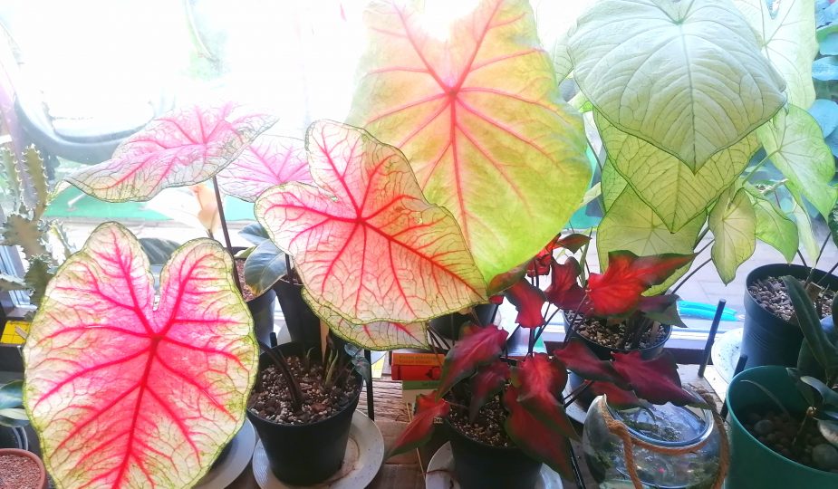 Laitoin keväällä viiden erilaisen caladiumin (Kirjolehti) mukuloita ruukkuihin. Kasvua alkoi tulla lajikkeesta riippuen 3-6 viikkoa mukuloiden istutuksesta. Tällä hetkellä caladiumit ovat suosikki- huonekasvejani, niiden lehtien kauneuden vuoksi.