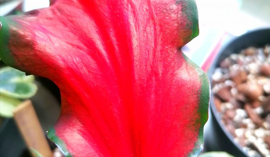 Siirsin caladiumit viikko sitten keinovalon alta itäikkunalle ja kasvu on ollut sen jälkeen tasaista. Ainoastaan Rhapsody ei ole tehnyt vielä kasvua. Caladiumeja pitää käännellä päivittäin, mikäli valo ei tule suoraan yläpuolelta. Muuten kasvi kasvaa vinoon ja alkaa kaatuilla. Eteläikkuna on caladiumille liian kuuma paikka, itä- tai länsi-ikkuna on sille parempi.