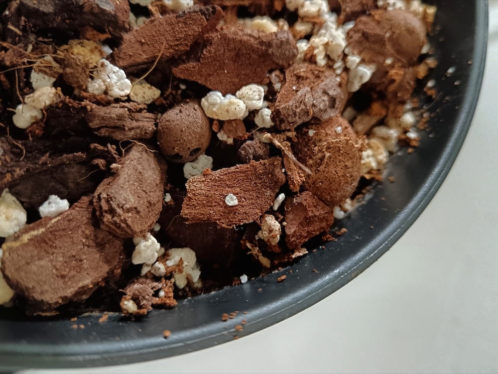 Laitoin kasville mullattoman kasvupohjan. Tein seoksesta melko kuohkean ja laitoinkin hienoa kookoskuitua vain noin 40% seoksesta. Kuohkeuttajaksi laitoin 20% perliittiä ja 20% hydrosoraa. Lisäksi laitoin seokseen 20% kaarnaa, sillä alocasiat tuntuvat tykkäävän kaarnasta. Kaarnaa imee itseensä nestettä melko hitaasti, joten kannulla kastellessa se kastuu vain pinnalta. Kastelua seuraavina minuutteina kaarna imee kasvupohjasta kosteutta itseensä ja tasoittaa näin kasvupohjan märkyyttä. Kaarna myös luovuttaa kosteutta hitaanlaisesti kasvin käyttöön; kaarnassa on vielä kosteutta kasville, kun muu kasvupohja on jo kuiva.
