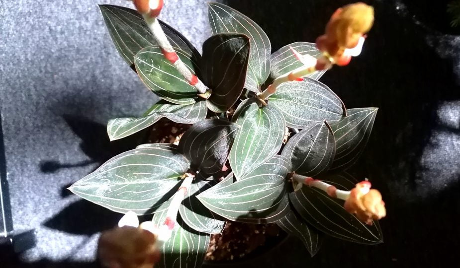 Jokaisen lehtiruusukkeen päähän nousee loppuvuodesta vaalea kukkavana, jossa on 10-30 valkoista, pientä kukkaa. Mitä suurempi lehtiruusuke on, sitä enemmän siihen yleensä kasvaa kukkia. Kukkavana voi nousta usean kymmenen sentin korkeuteen. Kukinta kestää viikkojen ajan ja sen jälkeen Ludisia kuolettaa kukkineet lehtivarret. Kukinnan aikana ja sen jälkeen kasvi kuitenkin kasvattaa maavarsiin uusia lehtiruusukkeita, jotka kukkivat taas seuraavana vuonna. Kukinta tapahtuu pimeänä vuodenaikana, joten keinovalon alla oleva kasvi ei välttämättä kuki, ellet vähennä siltä valoa.