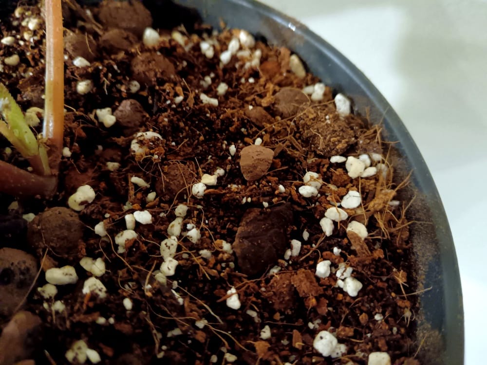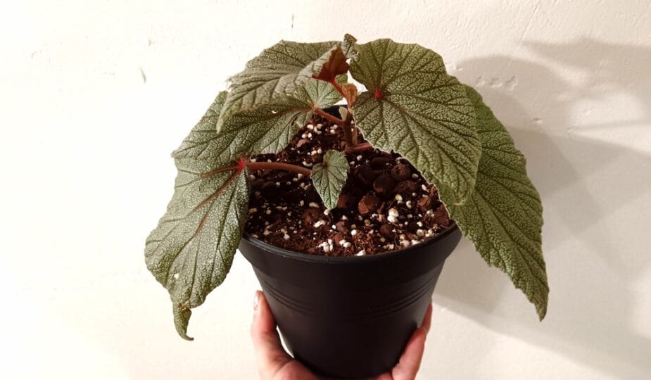 Kasvupohjaksi laitoin noin 60% Bionovan hienoa kookoskuitua ja noin 40% perliittiä ja hydrosoraa. Lisäksi heitin sekaan hieman kaarnaa happamoittamaan kasvupohjaa. Kaarnana käytin ”orkideamultaa”. Kookos pidättää vettä, joten laitoin sitä enemmän kuin yleensä, sillä begoniat ovat melko janoisia kasveja. Kookoksen tilalta olisi voinut käyttää multaakin. Mullaksi kannattaa valita turpeeton viherkasvimulta. Hydrosoran tilalta olisi voinut käyttää mitä tahansa kevytsoraa. Itse tykkään Cannan hydrosoran punaruskeasta väristä. Laitoin kasville isohkon ruukun, missä kasvupohja kuivuu hitaammin kuin pienessä ruukussa. Kasvia sanottiin internetissä nopeakasvuiseksi, joten isohko ruukku senkin takia. Näin ruukkua ei tarvitse vaihtaa heti isompaan.