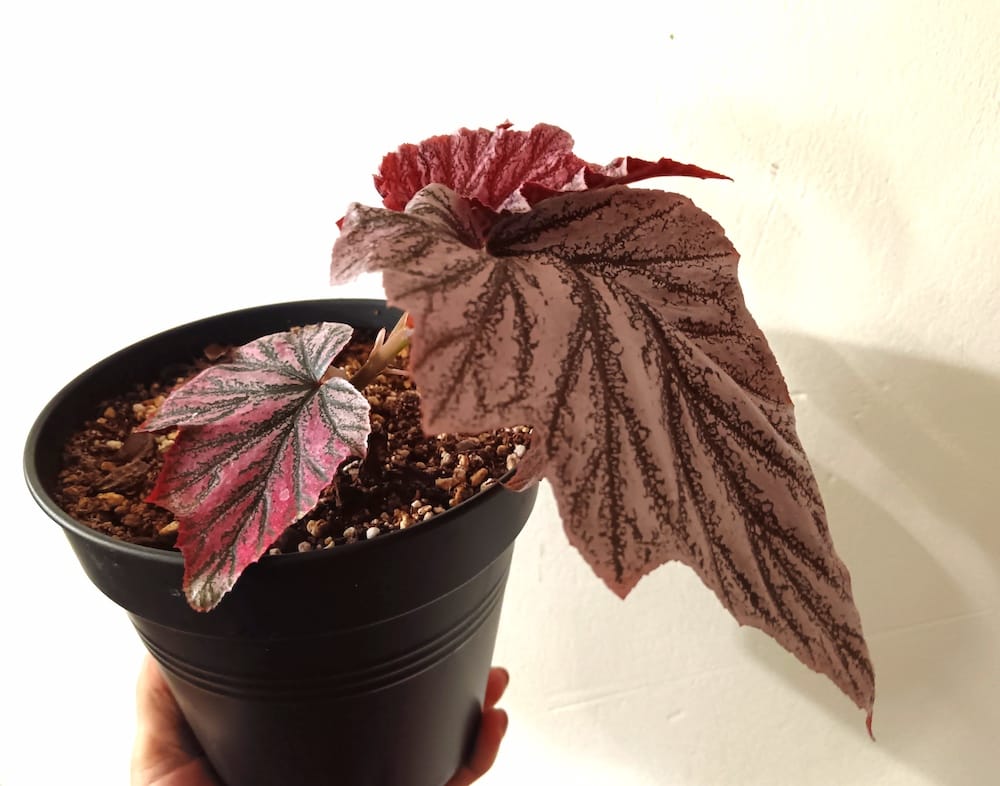 Vaihdoin tämän ihastuttavan begonian pistokkaan toiseen kasviin erään kasviharrastuskaverin kanssa reilu puolisen vuotta sitten. Juurrutin pistokkaan vedessä ja se saikin juuria melko nopeasti. Istutin pistokkaan Elhon muoviruukkuun ja seokseen, jossa on reilu 60% hienoa kookoskuitua ja loput perliittiä, hydrosoraa ja kaarnaa. Laitoin kookosta melko paljon, sillä begoniat pitävät hieman kosteasta kasvupohjasta ja kookos pidättää hyvin vettä. Kookoksen tilalta olisi voinut myös käyttää jotain mielellään turpeetonta multaakin. Vettä vähemmän pidättävät perliitti ja hydrosora tekevät seoksesta ilmavamman, mikä saa kasvin juuret viihtymään paremmin. Kaarna hieman happamoittaa kasvupohjaa, mikä on begonioiden mieleen.
