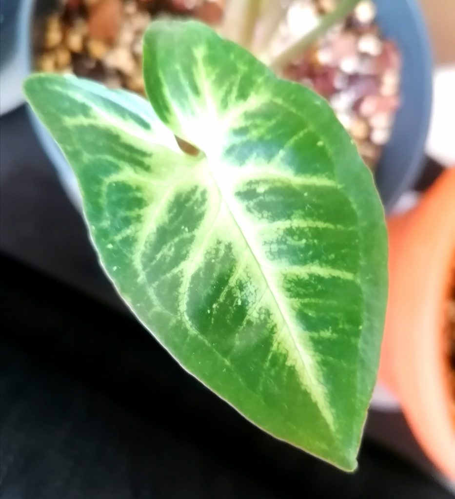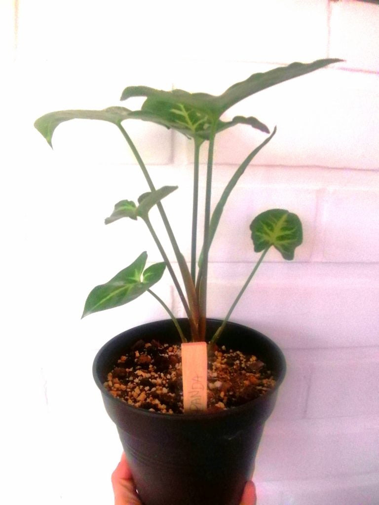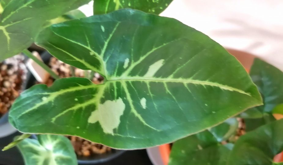 Pandalla on hieman punertavat lehtivarret ja kirkkaanvihreät lehdet. Lehdissä on usein vaaleanvihreät/ kellertävät, joskus lähes valkeat lehtisuonet ja niiden ympärystät. Lisäksi lehdissä on eri asteisia ja sävyisiä vaaleita osioita, laikkuja tai pilkkuja. Jokaisella lehdellä on uniikki kuviointinsa. Nuoret kasvin lehdet ovat nuolenpään malliset, vanhemmalla kasvilla lehdet liuskoittuvat kolmiosaisiksi.