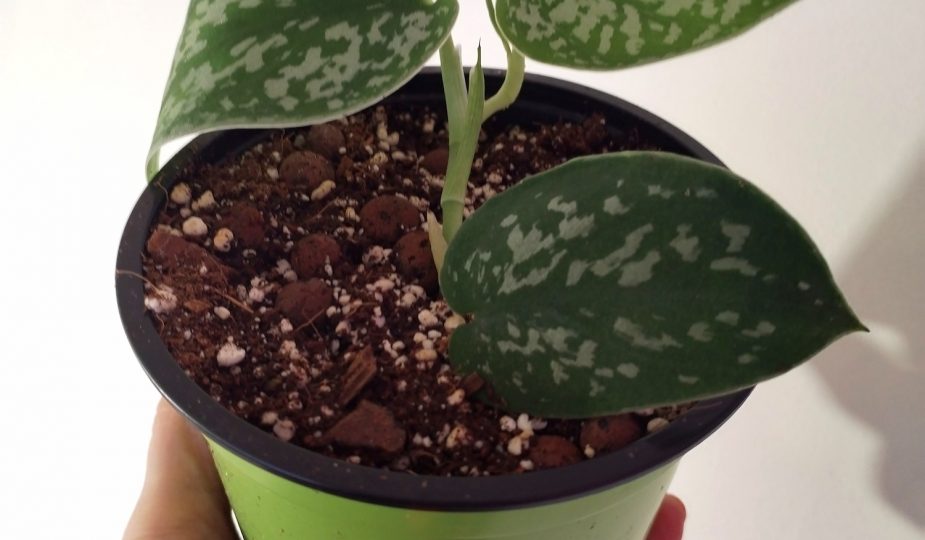 Päästän tälläkin hopeaköynnöksellä kasvupohjan kuivahtamaan kevyesti kasteluiden välillä. Kasvi ilmoittaa janonsa rullaamalla lehtiään. Lannoitetta annan joka toisella kastelulla myös talvella, sillä kasvi on keinovalon alla. Kasvupohjaksi laitoin puolet kookosta ja puolet perliittiä, kaarnaa ja hydrosoraa. Perliitti ja hydrosora tekevät kasvupohjasta ilmavamman ja niitä voi laittaa myös tavallisen mullan joukkoon. Näin kasvi ei ole niin herkkä liikakastelulle. Kaarna hieman happamoittaa kasvupohjaa, mikä on hopeaköynnöksen mieleen.