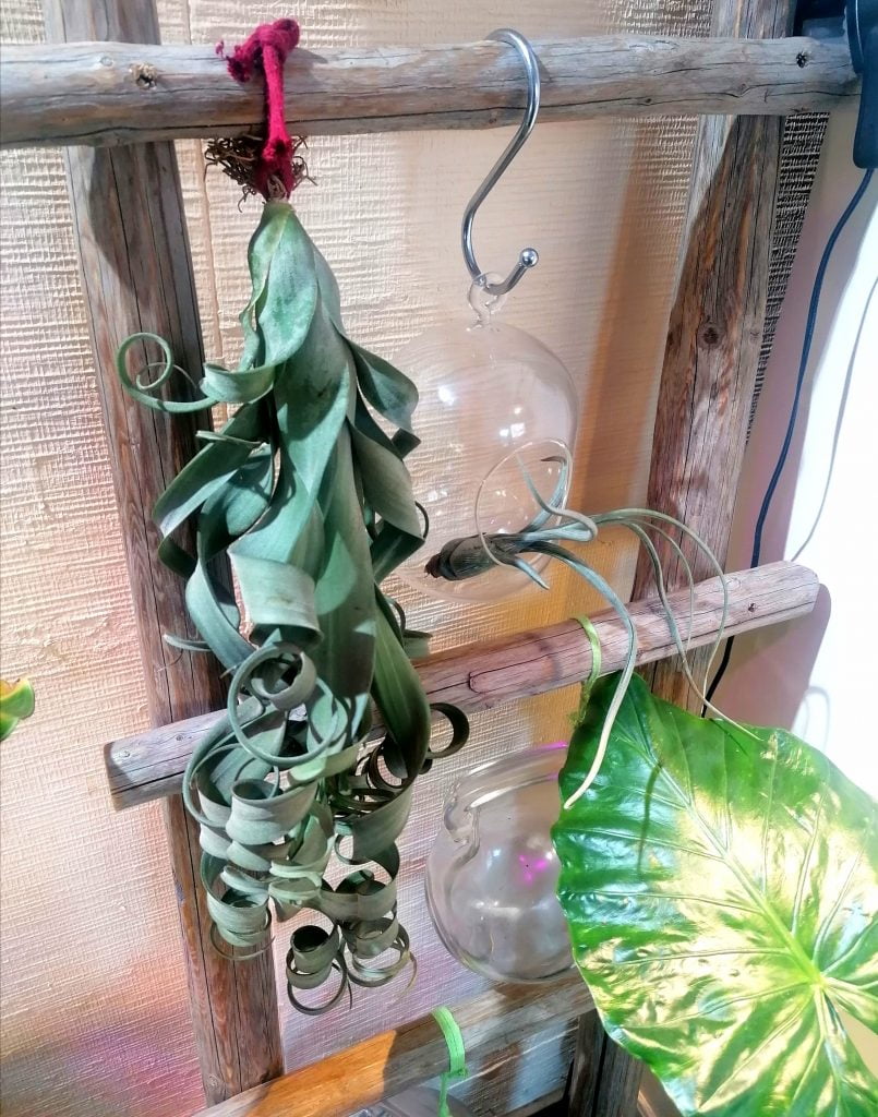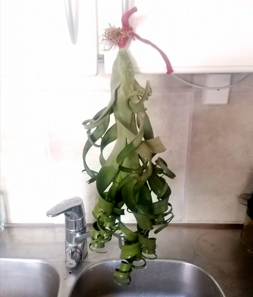 Itse otin kasvin pois kasvupohjasta ja trimmasin saksilla juuret lyhyeksi. Laitoin kasvin roikkumaan narulla pää alaspäin heinäseipäistä tehtyyn kasvitelineeseen. Curly Slimin voi laittaa myös oikein päin esimerkiksi lasiseen leveään maljakkoon tai asetella se makaamaan kyljelleen hyllylle.
