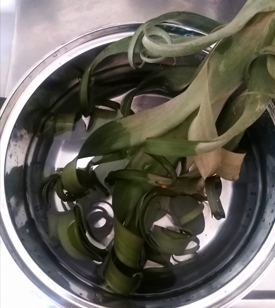 Sumuttelen Curly Slimin päivittäin ja kerran viikossa laitan sen kylpyyn. Upotan vain lehtien latvat veteen, jotta vettä ei menisi lehtiruusukkeeseen. Vesi jää sinne helposti hautumaan ja saattaa mädännyttää kasvin. Laitan kylpyveteen keväällä ja kesällä mietoa orkidearavinnetta ja annan kasvin olla vedessä vartin tai puolisen tuntia. Talvella ja syksyllä kylvetän miedossa merilevävedessä. Ravistelen kasvin kylvyn jälkeen ja annan sen valua lavuaarin päällä kaapin ovenkahvasta roikkuen. Koska pidän kasvia aina pää alaspäin, voin viedä sen takaisin paikalleen nopeasti. Mikäli pidät kasvia näytillä oikein päin, anna sen roikkua pää alaspäin pari tuntia kastelun jälkeen ennen paikalleen laittoa.
