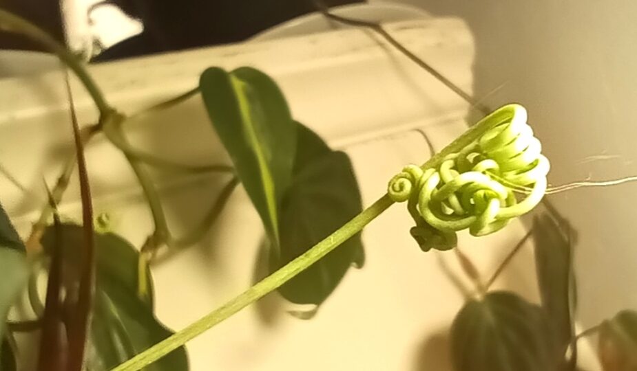 Kasville ei edellisessä asunnossamme oikein löytynyt paikkaa ja se unohtuikin pohjoisikkunalle. Kasvi kasvoi hentovartiseksi ja lehdet jäivät pieniksi ja osa niistä tippui pois. Muuton myötä kärsimyspassioni pääsi parempaan valoon keinovalon alle ja kasvi alkoi hieman piristyä. Se oli kuitenkin ehtinyt jo varistella paljon lehtiään, joten leikkasin pari vartta siltä lyhyeksi. Keväällä kasvi kannattaakin leikata, jotta se haarautuisi. Leikkaaminen myös stimuloi kukintaa. Kesäksi oma kärsimyskukkani pääsee kuistille, jossa on itäikkunat. Eteläikkuna voi sille olla liian paahteinen paikka ainakin totuttamatta. Kasvi tarvitsee säleikön tai jonkin muun tuen ja se on nopeakasvuinen. Omani on kuitenkin nyt ollut ilman kasvitukea ja kasvaa hyllyn reunalla roikkuvana. Kuistille päästyään kasvi saa jonkinlaisen tuen.