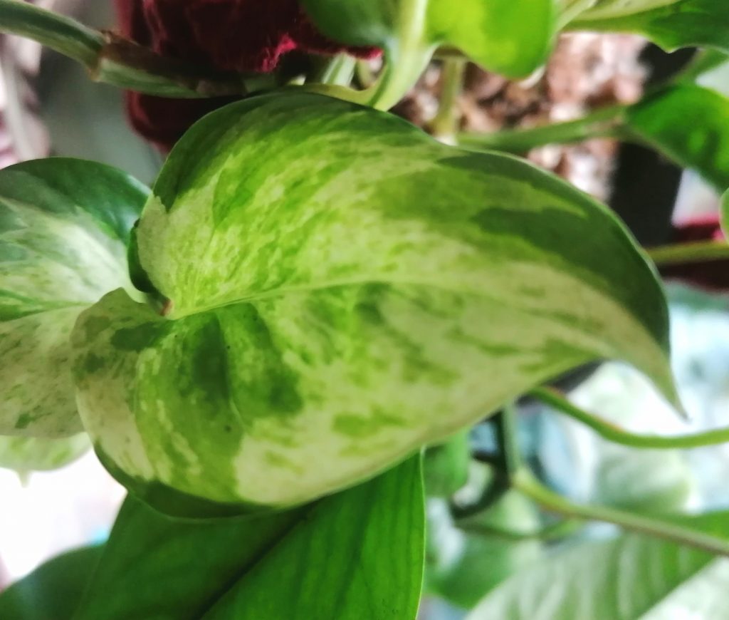 Minulla on ollut jo jonkin aikaa kultaköynnös Marble Queen (Epipremnum Marble Queen) olohuoneen itäikkunalla amppelissa. Kasvia kutsutaan myös nimellä Devils Ivy. Marble Queenillä on sydämenmuotoiset ja valkovihreät marmorikuvioiset lehdet. Jos se taantuu, eli alkaa muodostaa täysvihreitä lehtiä, kutsutaan sitä silloin Jadeksi. Sanotaan, että heikossa valossa kasvi taantuu helpommin vihreäksi kuin runsaassa valossa. Kasvi yhteyttää vain vihreillä kasvinosilla, joten se hämärässä alkaa tuottamaan enemmän vihreitä lehtiä.