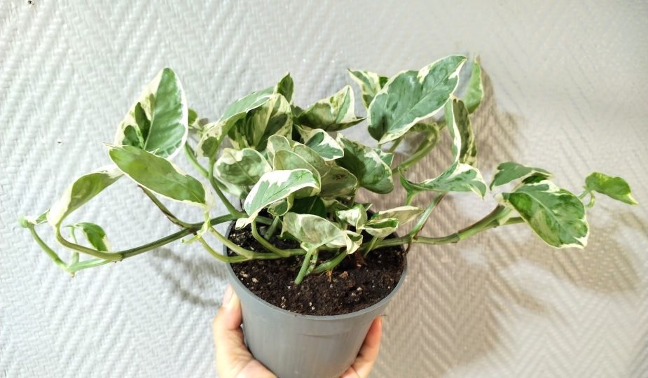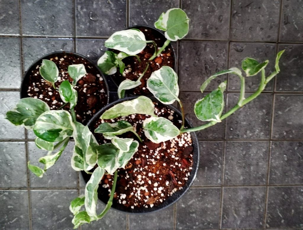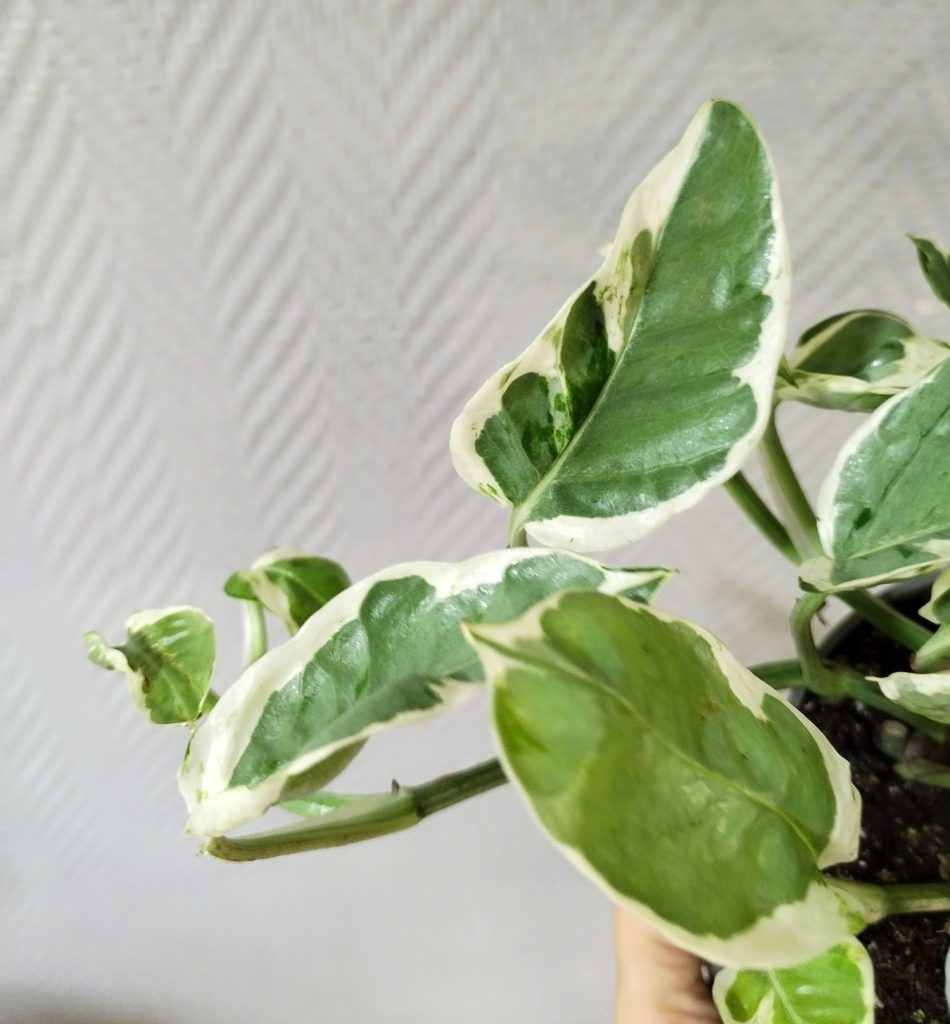 Olin jo hetken haaveillut tästä lajikkeesta, joka on tietämäni mukaan kultaköynnös Marble Queenin mutaatio. Kasvin lehdillä vuorottelee erilaisina läiskinä valkoinen, helmenvalkoinen ja eri vihreän sävyt. Lehdet jäävät todennäköisesti pienemmiksi kuin perinteisellä kultaköynnöksellä ja varren kasvutapakin on tiiviimpi. Pearls and Jade myös yleensä kasvaa monia muita kultaköynnöksiä hitaammin. Lehden muoto ei ole niin täydellinen sydän kuten perus kultaköynnöksellä, vaan ne voivat olla jopa hieman epämuodostuneita ja epäsymmetrisiä.