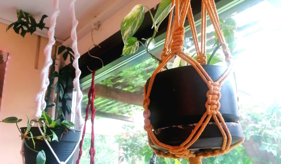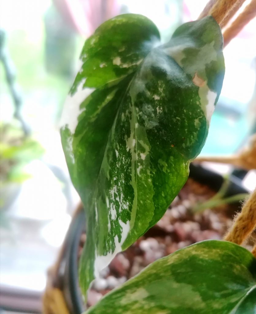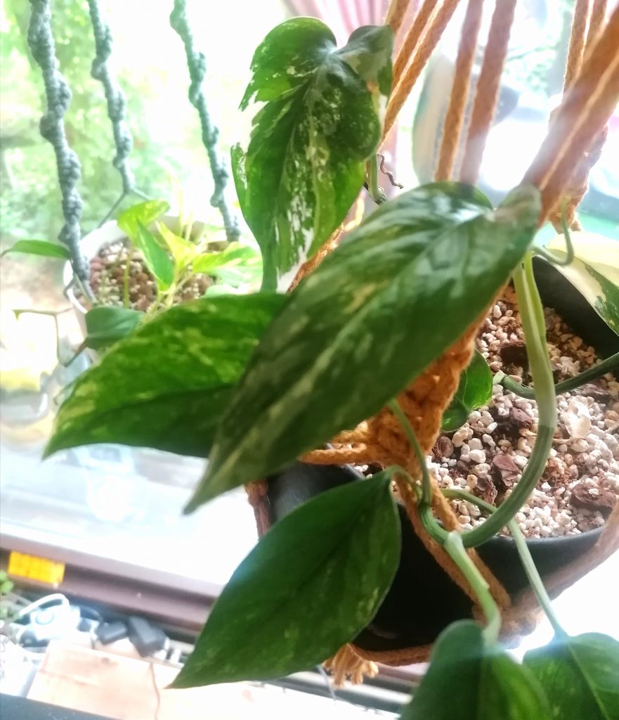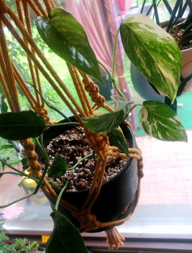 Kultaköynnös Variegata selviää melko vähälläkin valolla. Silloin tosin kasvu jää honteloksi ja lehdet pieniksi. Sumuttelen kasvin ainakin kerran päivässä, sillä se rakastaa korkeaa ilmankosteutta.