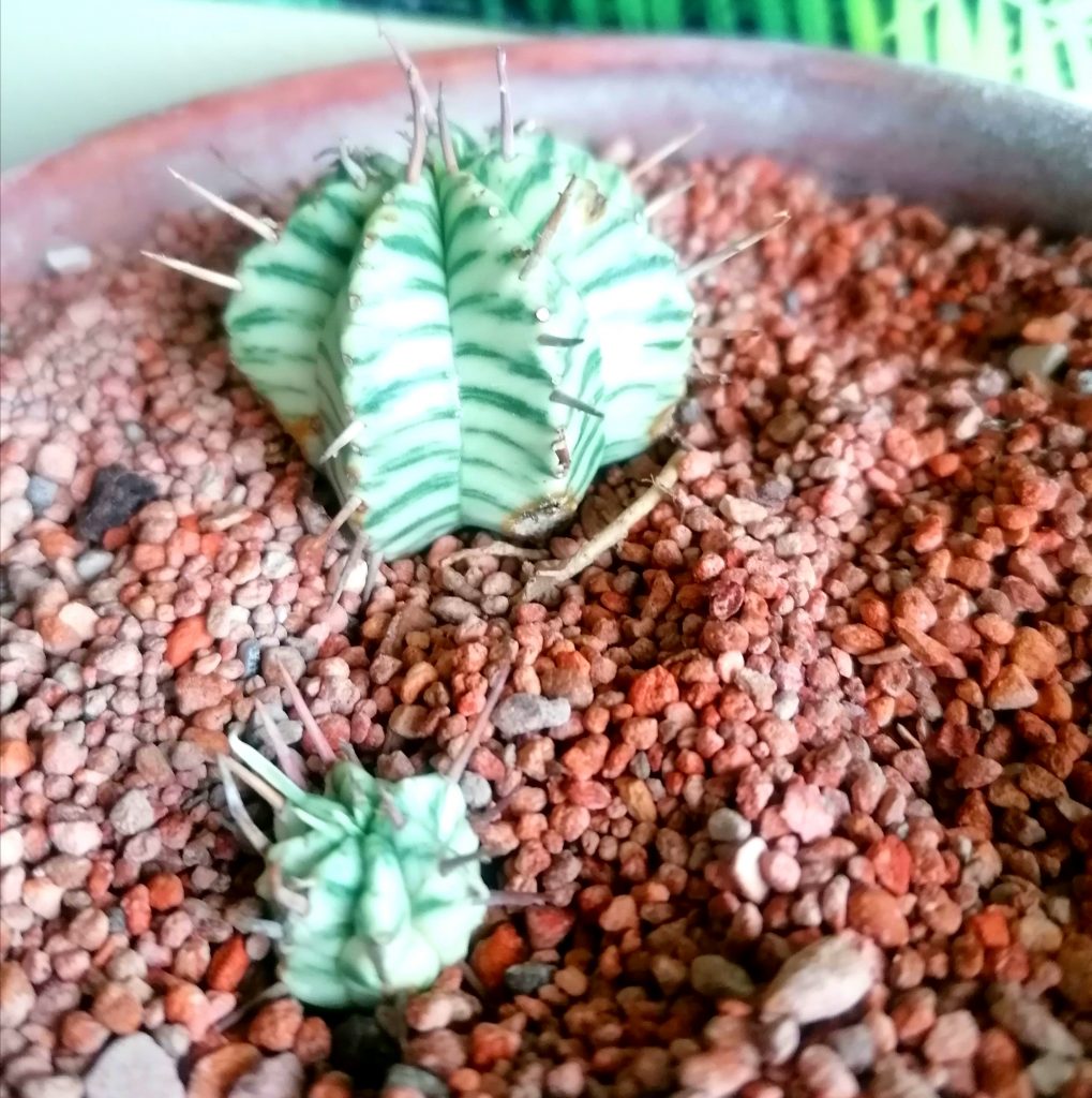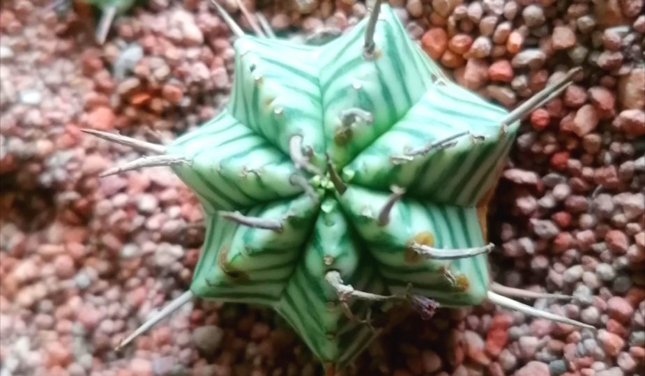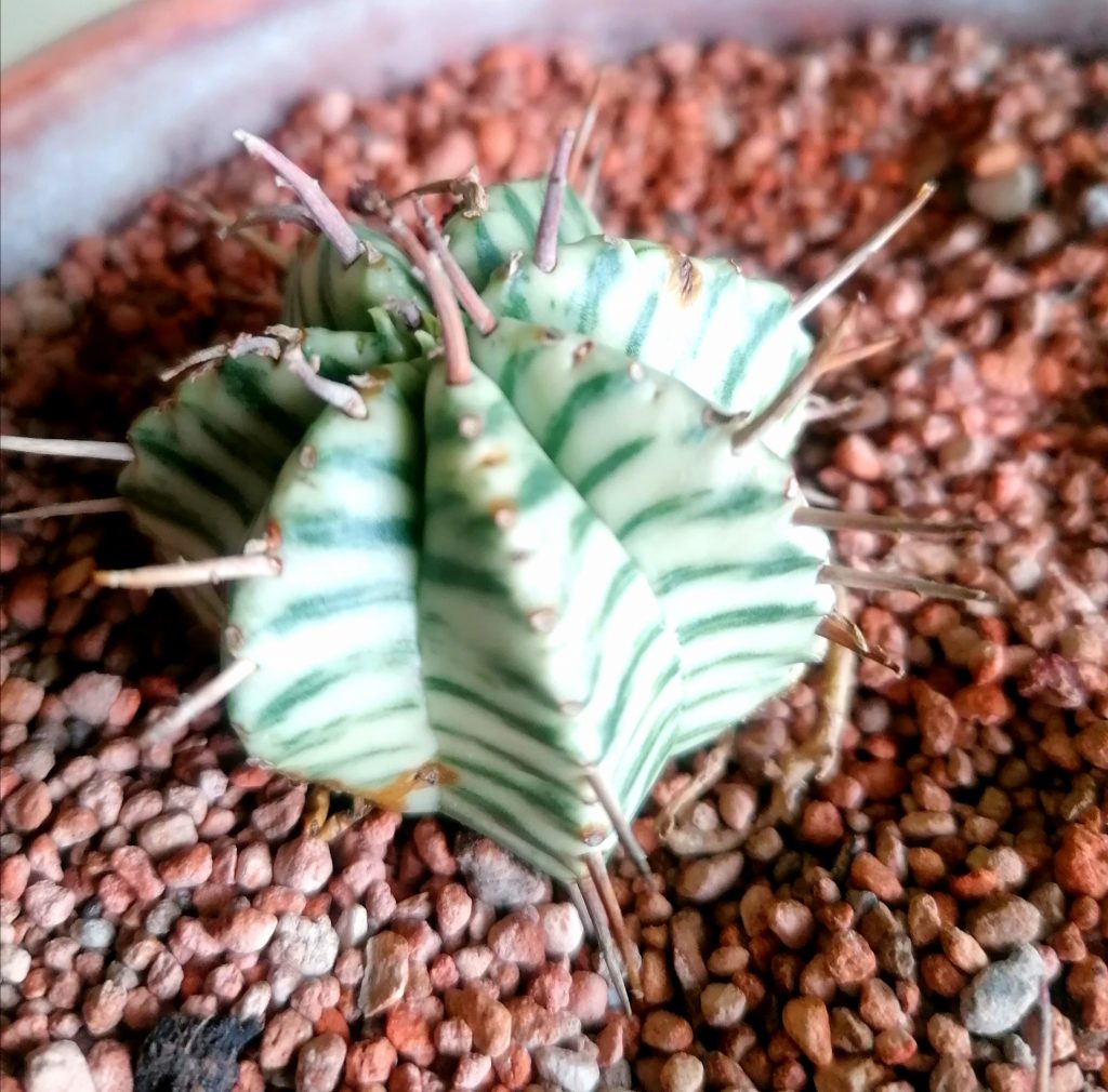 Kasvi on hidaskasvuinen pyöreä piikikäs pallo. Kasvi on ollut minulla puolisen vuotta, eikä ole inahtanutkaan sinä aikana. Tämä variegata versio on väriltään valko-vihreä raidallinen. Kasvissa on lohkoja, jossa kussakin on pystyrivistö piikkejä. Piikit ovat melko kovat.