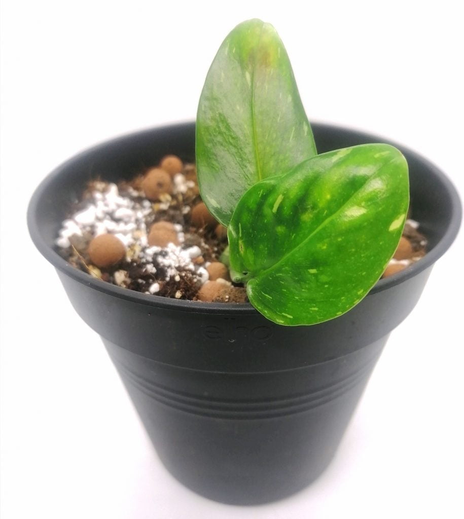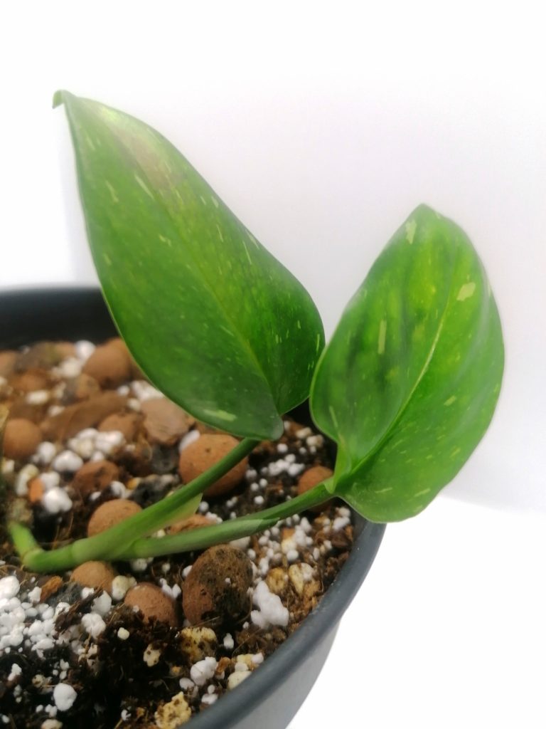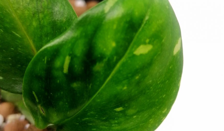 Kasvilla on ovaalin malliset lehdet, joissa on tummanvihreällä pohjalla vaaleanvihreitä, kermanvalkoisia/ valkoisia viiruja, pisteitä ja läikkiä. Lehdoissä voi olla reikiä ja ne voivat kasvaa 15cm pitkiksi. Kasvi on köynnös, joten sille kannattaa laittaa jonkinlainen kasvituki, ellet laita kasvia kasvamaan amppelissa roikkuvana. Kasvi kasvaa kasvitukea pitkin kiipeilevänä yleensä suuremmaksi, kuin amppelissa roikkuessaan.