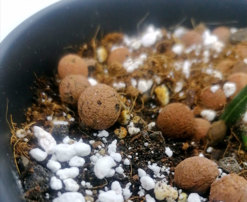 Istutin pistokaaan mullattomaan sekoitukseen, johon laitoin vajaa puolet kookoskuitua ja reilu puolet perliittiä, kaarnaa ja kevytsoraa. Näin kasvupohjasta tuli kuohkea ja sopivasti vettäpäästävä, jotta juuret eivät altistu juurimädälle. Kaarnana käytin Kekkilän orkideamultaa. Perliittiä, kaarnaa ja/tai kevytsoraa voi sekoittaa myös tavallisen viherkasvimullan joukkoon, mikäli kookos tuntuu vieraalta.