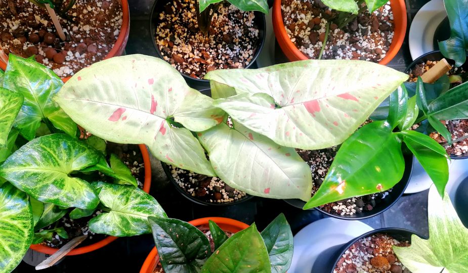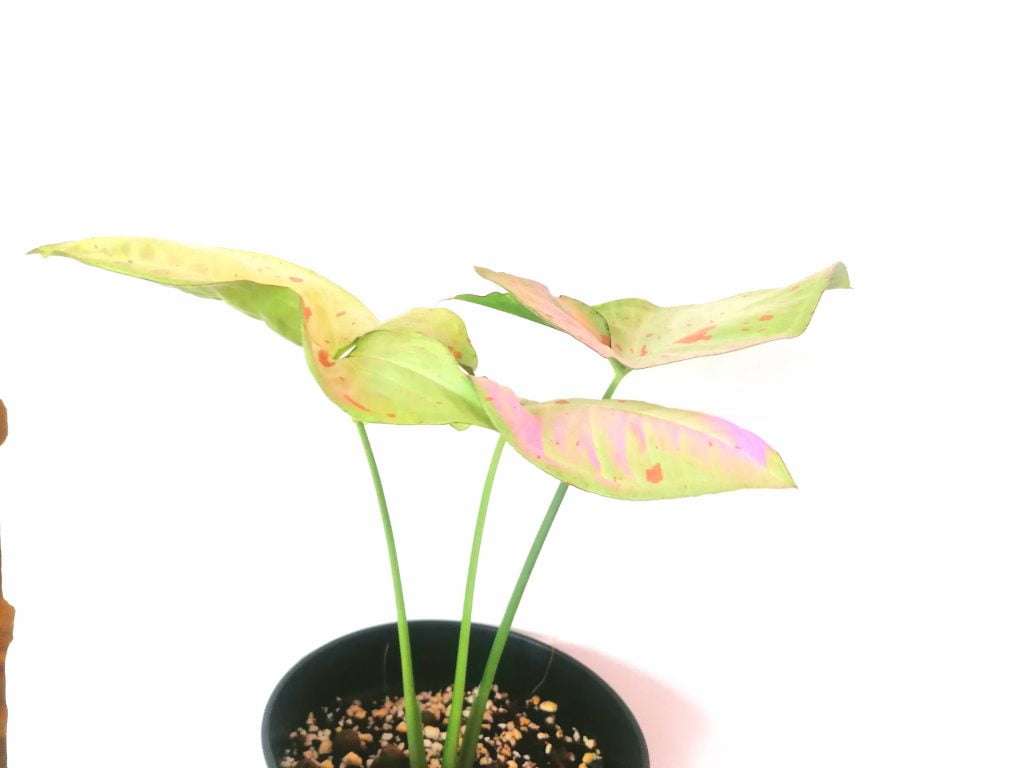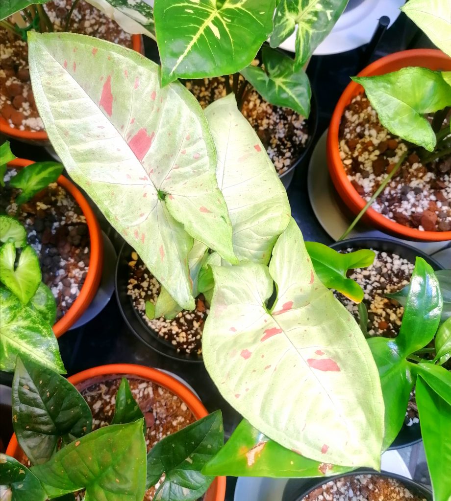 Tämän harvinaisemman muulinkorvan (Syngonium podophyllum Confetti Tricolor) sain juurtuneena pistokkaana ystävältä. Confetilla on todella kauniit ohuehkot lehdet, joissa on valkoista, vaaleanpunaista ja vaaleanvihreää erilaisina kuvioina. Nuorena lehdet ovat nuolenpään malliset, vanhemmalla kasvilla lehdet muuttuvat kolmiosaisiksi.
