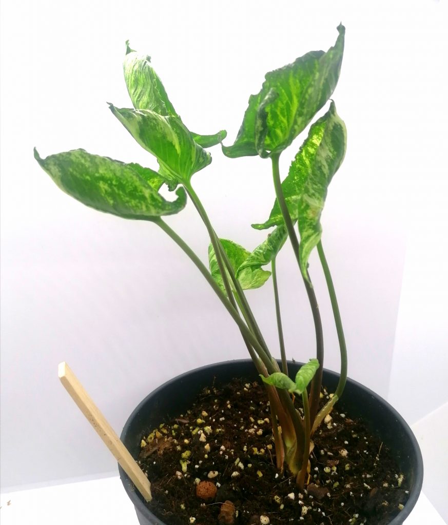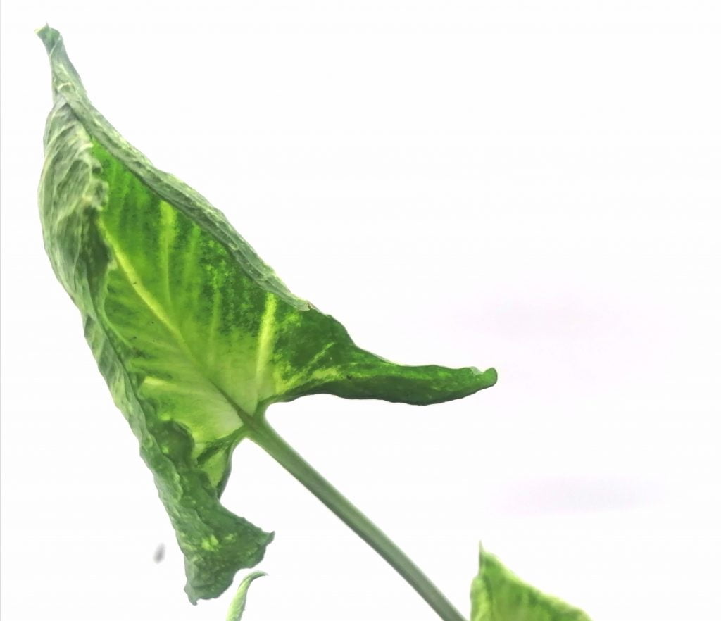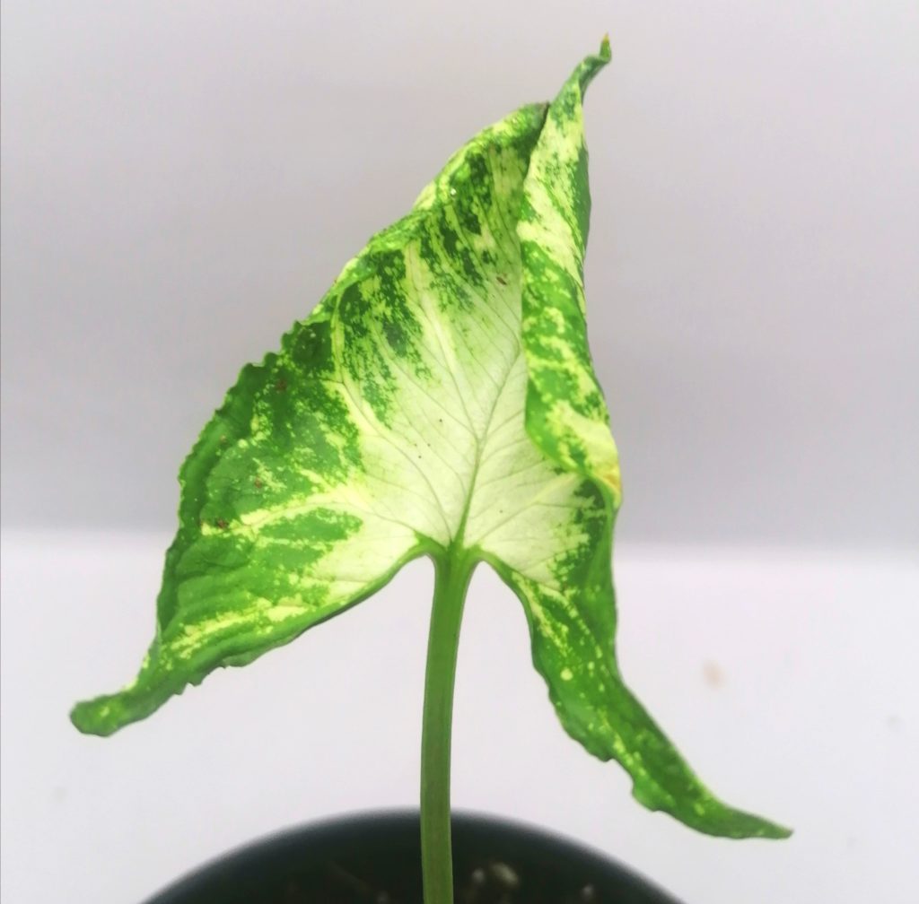 Tähän ihanuuteen ihastuin netissa muutama viikko sitten ja pakkohan se oli ostaa, kun sellainen löytyi Bens-jungle.de nettikaupasta. Kasvi on tällä hetkellä keräilijöiden suosiossa, enkä ihmettele. Kasvilla on tummanvihreät lehdet vaalealla keskustalla ja lehtisuonilla. Kasvin lehdet ovat reunoiltaan käpristyneet ylöspäin, mikä tekee kasvista uniikin ja mielenkiintoisen. Nuorella kasvilla on nuolenpään muotoiset lehdet, jotka vanhemmalla kasvilla liuskoittuvat moniosaisiksi.