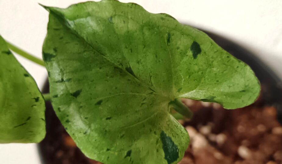 Tätä kasvia myydään myös nimellä Syngonium Green Splash. Omani sain toiselta kasviharrastajalta. Muulinkorva Grey Ghost on ollut toivekasvilistallani pitkään. Pidän lehtien harmaanvihreästä väristä ja tummanvihreistä läikistä ja pilkuista. Keräilen erilaisia muulinkorvia ja tämä oli loistava lisä kokoelmaani.