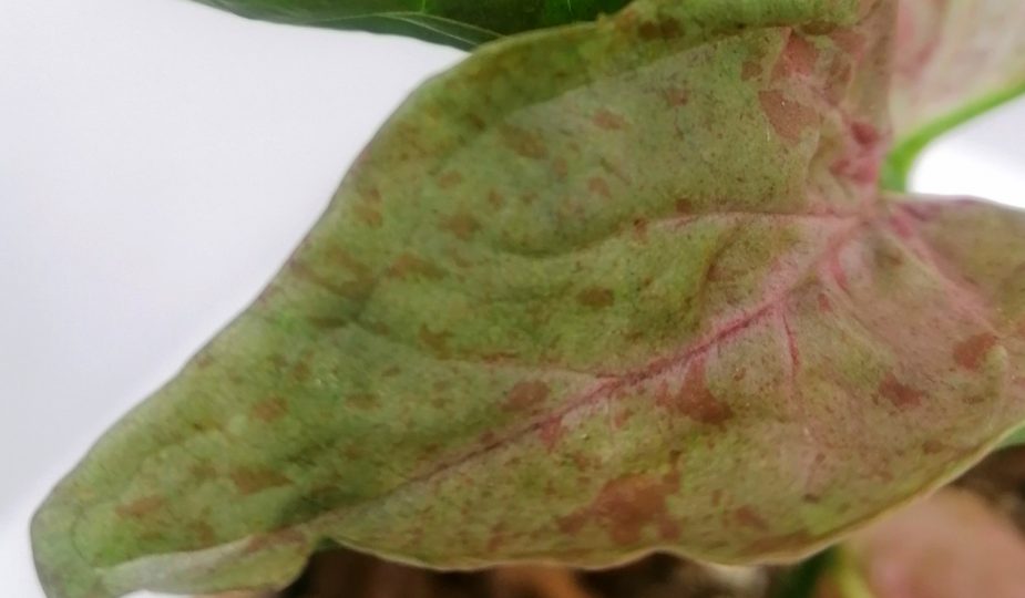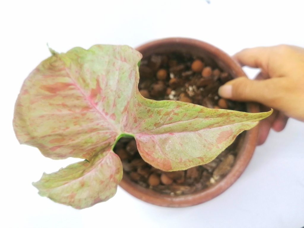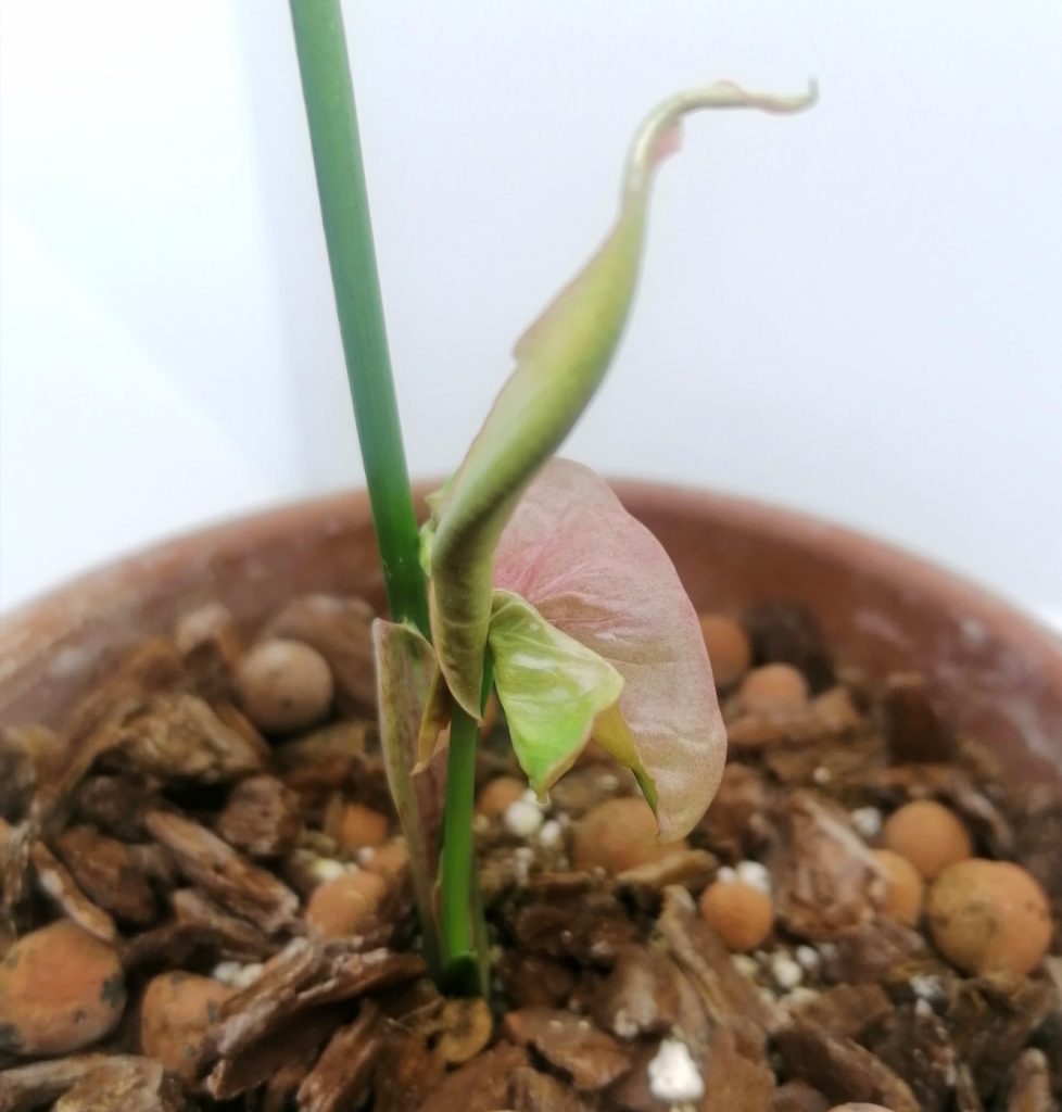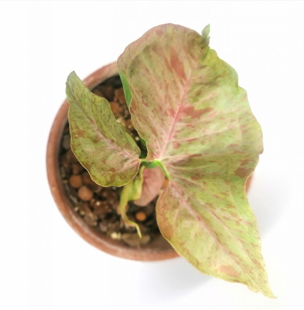 Tämä muulinkultakorva (Syngonium podophyllum Pink Spot) on hieman harvinaisempi lajike ja löysin sen yksilehtisenä ja juurtuneena pistokkaana Royalplant.fi verkkosivustolta. Pistokas tuli hyväkuntoisena perille. Sen kermanvaaleilla/vaaleanvihreillä lehdillä on pinkkejä ja punaisia läikkiä ja pisaroita. Lehden alapinta on vihreä. Kasvi on myrkyllinen.