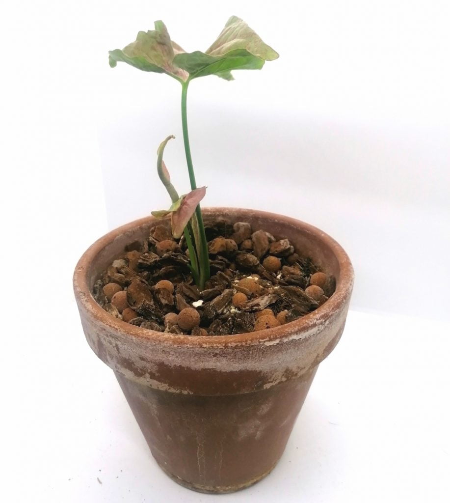 Istutin kasvin heti sen tullessa mullattomaan kasvupohjaan, johon tuli noin puolet kookoskuitua ja loput perliittiä, kaarnaa ja kevytsoraa. Kookoskuidun tilalta voi käyttää myös viherkasvimultaa. Perliitti ja kevytsora tekevät kasvualustasta ilmavamman, mikä saa kasvin juuret voimaan paremmin. Kaarna happamoittaa hieman kasvupohjaa, mikä on muulinkultakorvan mieleen.