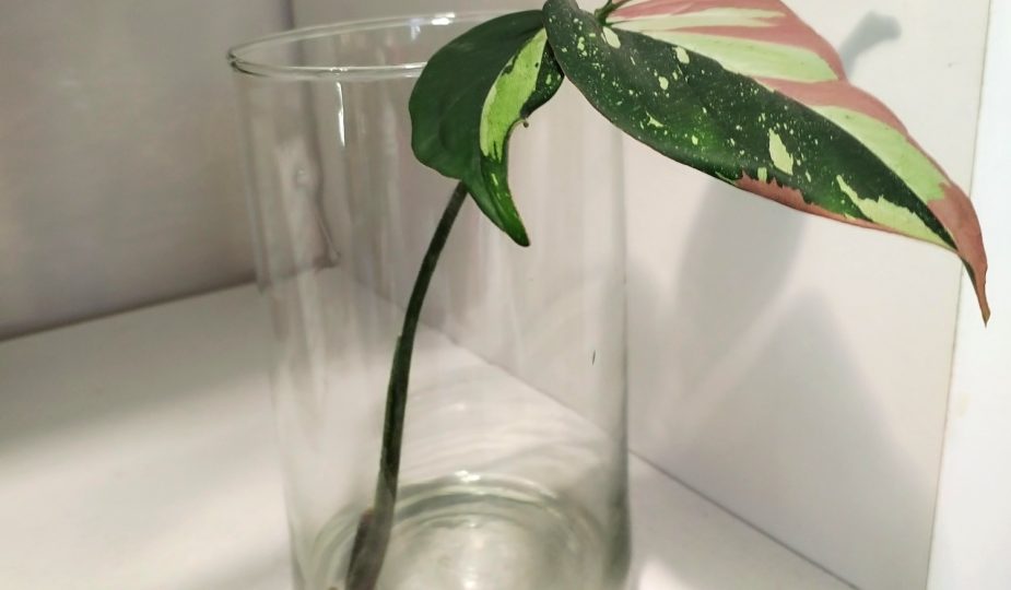 Laitoin pistokkaan matalaan veteen juurtumaan. Laitoin vettä pienen lasisen maljakon pohjalle niin, että pistokkaan juurinystyrät jäivät juuri ja juuri vedenpinnan yläpuolelle. Veden joukkoon laitoin tipan Bionovan juurtumisen edistäjää. Pistokkaassa oli jo pari juurinystyrää, joista toinen on lähtenyt heti kasvuun vedessä muutamassa päivässä. Yleensä muulinkorvat juurtuvat vauhdilla.
