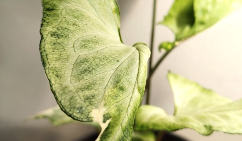 Tämä muulinkorva (Syngonium Starlite) tarttui käteeni Bauhausissa. Kasvilla on hauskat lehdet, jotka ovat usein toispuoleiset sekä kapeat ja jäävät pienemmiksi kuin monella muulla muulinkorvalla. Lehdissä on tummanvihreällä pohjalla valkoista/ vaaleamvihreää väriä laikkuina, ”huurteena” tai viiruina. Myös harmaanvihreä väri seikkailee lehdillä.