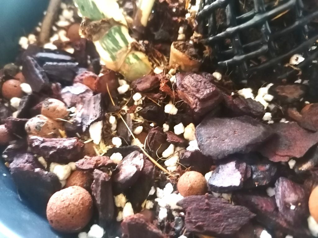 Kasvupohjaksi laitoin peikonlehdelle mullattoman sekoituksen, jossa on kookosta, perliittiä, kaarnaa ja kevytsoraa. Kookosta laitoin hieman alta puolet seoksesta. Perliitti ja kevytsora tekevät kasvupohjasta kuohkeamman, mikä saa kasvin juuret viihtymään paremmin. Kaarna happamoittaa hieman kasvupohjaa, mikä on peikonlehden mieleen. Laitoin kasville melko ison ruukun, jotta se ei kaatuilisi sammalkepin ja lehtien painosta.