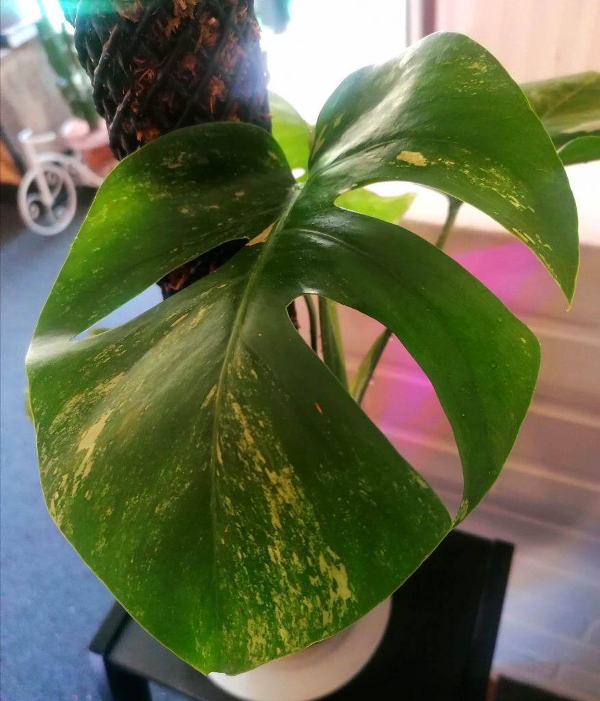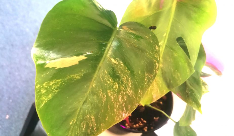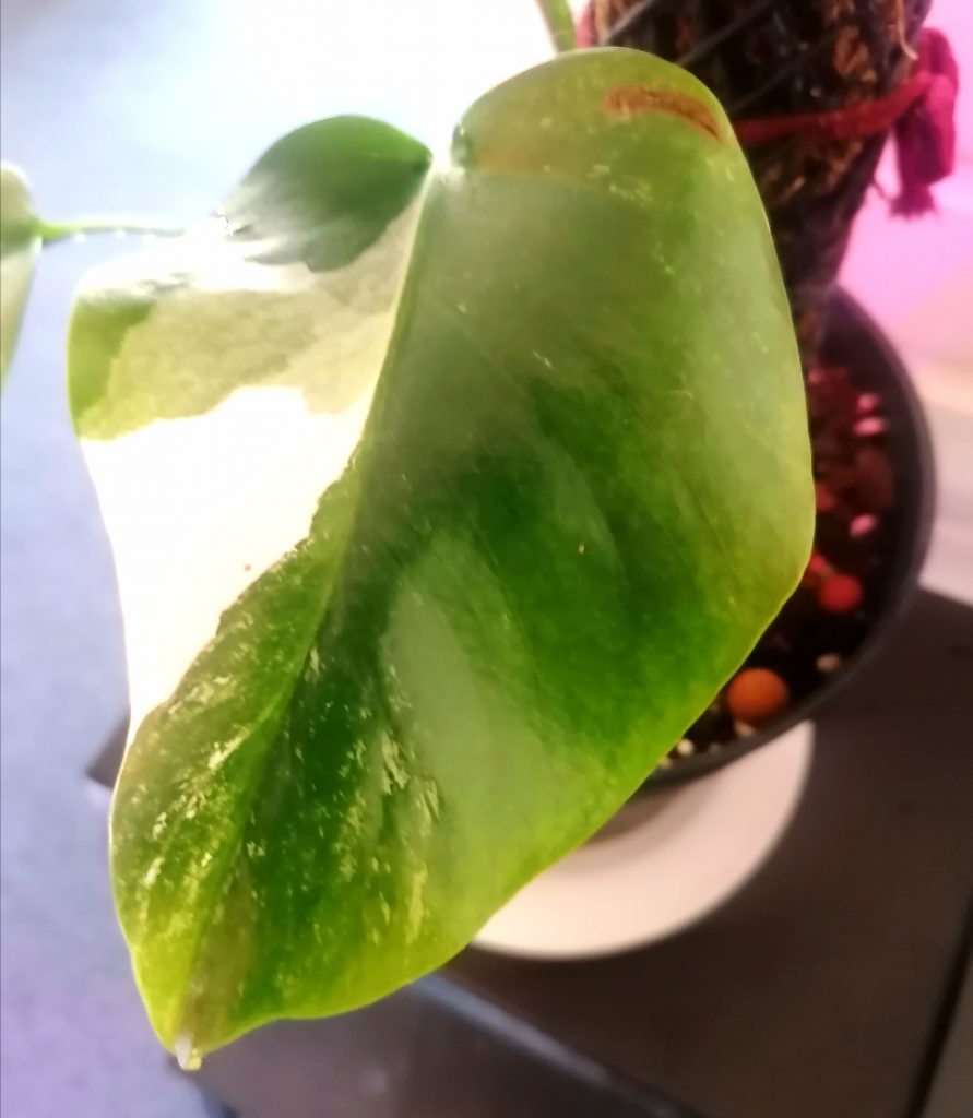 Peikonlehti Variegata pystyy yhteyttämään vain vihreillä kasvinosillaan. Siksi kasvi kaipaakin paljon valoa. Omani on 50W sini-puna-ledin alla. Talvella kasvi oli heikomman valon alla ja kasvu tyrehtyi. Nyt kasvi on päässyt kunnon valoon ja on tehnyt heti pari uutta lehteä, jotka ovat myös liukoittuneet. Kaikissa lehdissä on kivasti värivirhettä, muttei liikaa, jotta kasvi on elinvoimainen.