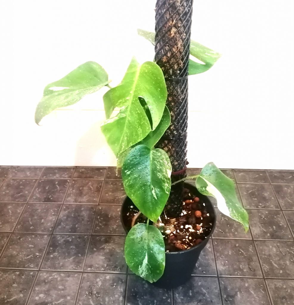 Vajaa vuosi sitten sain ystävältä lahjaksi värivirheellisen peikonlehden (Monstera deliciosa Variegata) hyvin juurtuneen pistokkaan. Pistokkaassa oli tullessaan yksi lehti.
