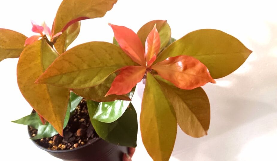 Karibianpuukaktuksen lehdet ovat uusina punaisia/oransseja ja ne muuttuvat ajan myötä kellertävämmiksi ja lopulta vihreiksi. Uusien lehtien alapinta on purppuranpunainen ja nekin vihertyvät lehden vanhetessa. Lehdet ovat veneen muotoiset ja melko rennot. Lehtien kiinnityskohdissa varressa on teräviä piikkejä. Lehdille voi tulla mittaa yli 10 senttiä.