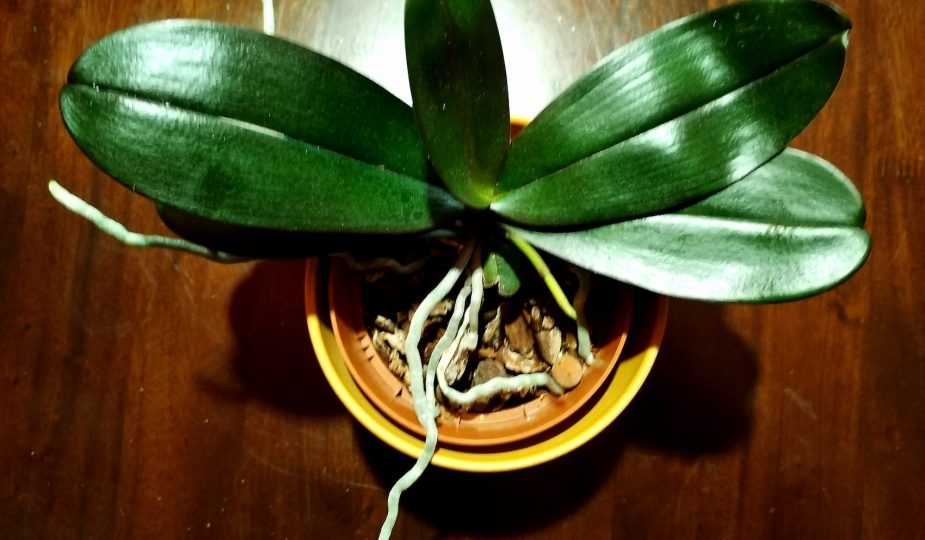 Jostain syystä perhoskämmekkäni on alkanut tänä vuonna viihtyä yhtäkkiä paremmin ja on tehnyt uusia lehtiä ja ilmajuuria. Hoitoni on ollut vähäistä; olen lorauttanut pari lorausta vettä silloin tällöin muistaessani. Orkidealannoitetta olen antanut joskus, ehkä kerran puolessatoista kuukaudessa. En ole jaksanut uppokastella ruukkua, vaikka sitä suositellaankin kastelutavaksi.