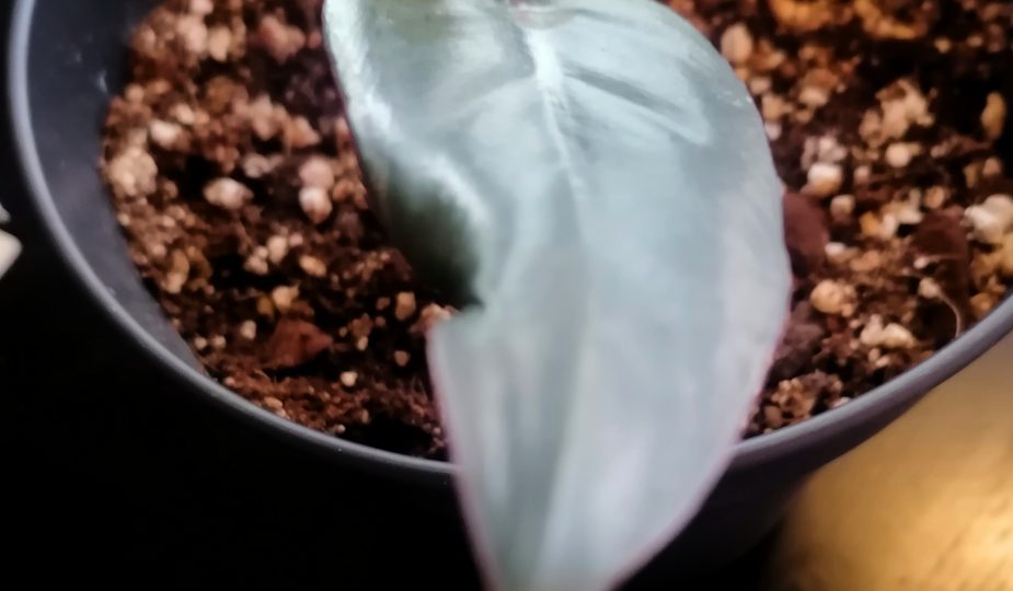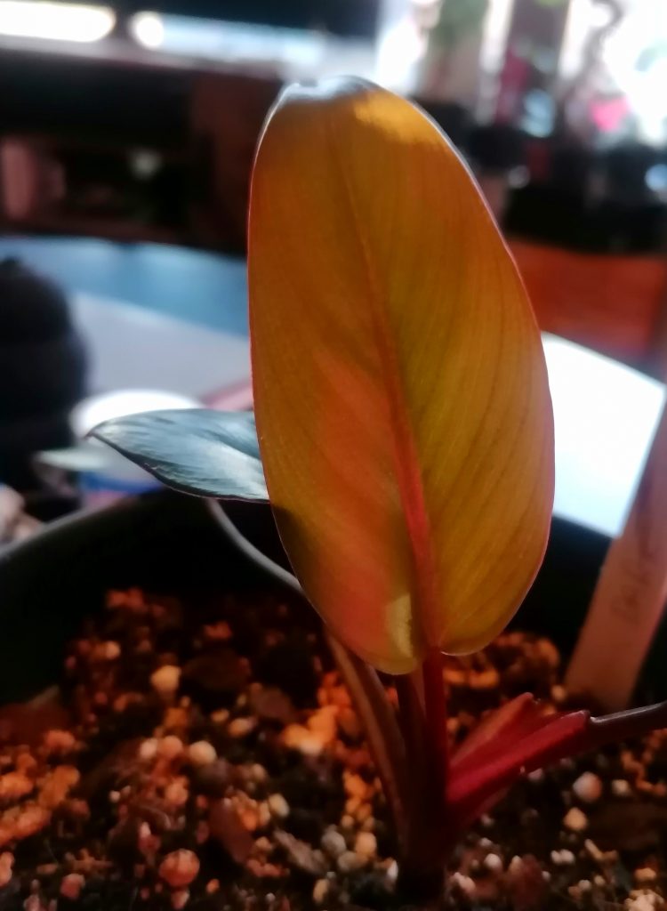 Omani on vielä aika pieni. Dark Lord voi kasvaa hyvin suureksi ja sen lehdet voivat olla halkaisijaltaan puolimetrisiä. Uudet lehdet ovat kellertävät/ pronssin väriset, mutta ne tummuvat verenpunaisen kautta jopa lähes mustiksi ajan myötä. Lehtien alapinta on metallihohtoisen kastanjanruskean värinen. Pienen kasvin väriloisto ei ole yleensä niin hieno, kuin hieman vanhemman yksilön. Odotankin innolla kasvin kasvua ja oikein mustia, punaisia ja oransseja lehtiä.