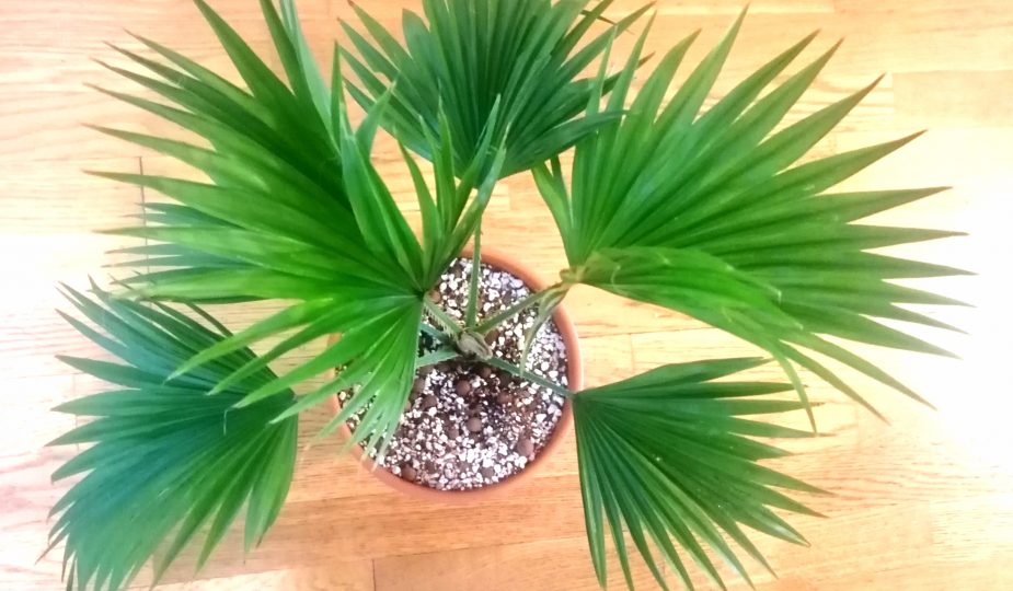 Sädepalmulle kelpaisi varmasti myös mullaton palmumix-kasvupohja, jossa on lecasoraa- seramista ja kaarnaa. Itselläni ei näitä aineksia sattunut kotona olemaan, joten tein kookospohjaisen kasvupohjan. Kaarna, perliitti ja hydrosora tekevät seoksesta ilmavampaa, jolloin liikakastelun vaara pienenee. Lisäksi laitoin sädepalmuni hengittävään saviruukkuun, jolloin kasvupohja kuivuu nopeammin kuin muoviruukussa. Uuteen ruukkuun sädepalmu laitetaan, kun vanha on täynnä juuria. Paras ajankohta uudelleenistutukseen on kevät ja kesä.
