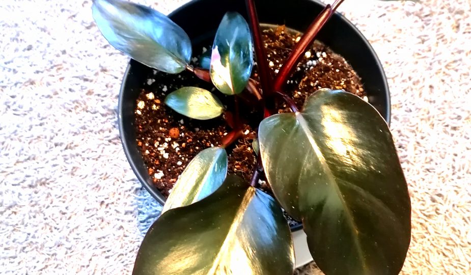 Kasvin saapuessa, huomasin saaneeni kaksi kasvia yhden hinnalla. Emokasvin viereen oli nimittäin kasvanut pieni poikanen. Jätin molemmat samaan ruukkuun vielä kasvamaan ja vaihdoin kasville kasvupohjan. Philodendroneille sopii jokin vettäpäästävä kasvupohja. Omani laitoin kookos-perliitti-hydrosora-seokseen. Mikäli mullaton ei ole tuttu juttu, voit laittaa esimerkiksi hiekansekaista viherkasvimultaa, johon isket puolet kevytsoraa tai perliittiä. Pink Princess pitää hieman happamasta, joten kasvupohjaan voi laittaa myös kaarnaa happamoittajaksi. Omalleni ajattelin antaa lorauksen laimennettua kahvia silloin tällöin, mikä happamoittaa kasvupohjaa.