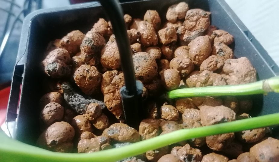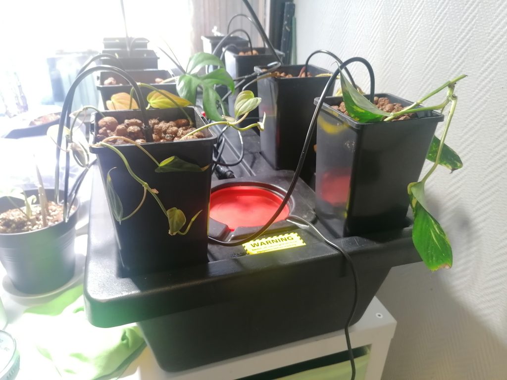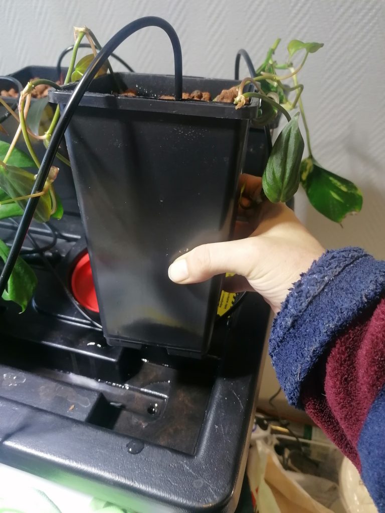 Ruukkuihin sain Vpluxilta valmiiksi pestyä hydrosoraa. Näin säästyin soran pesemiseltä. Pesemättömänä sora olisi voinut tukkia letkut ja pumpun. Viljelmän kokoamiseen ja ruukkujen täyttämiseen hydrosoralla meni parisenkymmentä minuuttia, minkä jälkeen sainkin alkaa laittaa pistokkaita ruukkuihin.