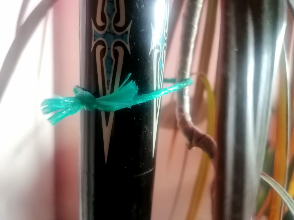 Kapeaan keppiin kasvin saa kiinni myös leipäpussinsulkijalla. Ne ovat ilmaisia ja samalla säästää luontoa, kun uudelleenkäyttää sulkijat. Pussinsulkijoissa on aina viimeinen myyntipäivä- leimaus. Päivämääristä onkin hauska seurata, milloin on suurinpiirtein kiinnittänyt kasvin mihinkäkin kohtaan. Näin voi seurata, kuinka nopeasti kasvi on kulloinkin kasvanut.