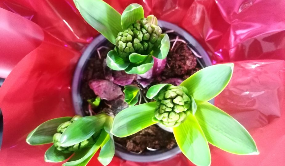 Hyasintin sipuleita on istutuksessa kolme. Koska ei ollut pakkasta, kannoin kasvin paljaana kaupasta kotiin. Hyasintti ei pientä viileyttä pelästy ja kukkii itseasiassa pidempään, kun saa viettää yönsä esim jääkaapissa tai lasitetulla verannalla. Itse tuskin jaksan siirrellä kasvia, mutta ainakin sijoitin sen kauaksi patterista ruokailupöydälle.