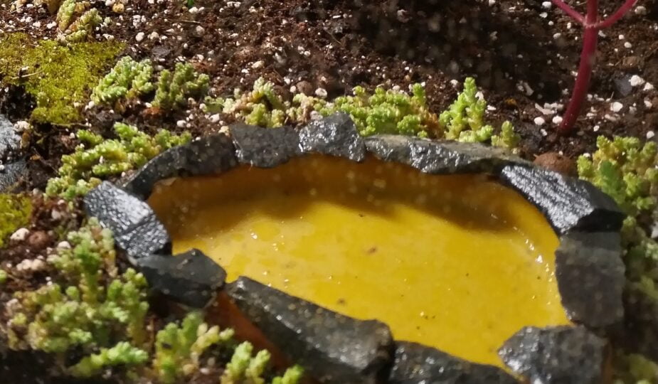 Kun olin saanut kasvupohjan paikoilleen terraan, asettelin Zoo- nettikaupasta tilaamani matelijoiden juoma-altaan lammeksi kasvupohjan päälle pieneen minipuutarhaani. Allas olisi voinut olla syvempi, sillä sen mataluuden johdosta sitä joutunee täyttämään päivittäin. Hetken allasta katseltuani, tulin siihen johtopäätökseen, että allas on paljon rumempi kuin nettikaupan kuvassa. Päätin tehdä altaalle liiman ja pikkukivien avulla kivireunuksen ja altaasta tulikin paljon paremman näköinen. Haluaisin vielä vaihtaa altaan väriä keltaisesta siniseksi, mutta nyt en jaksanut miettiä käytännön toteutusta. Niinpä allas jäi nyt vielä keltaiseksi.
