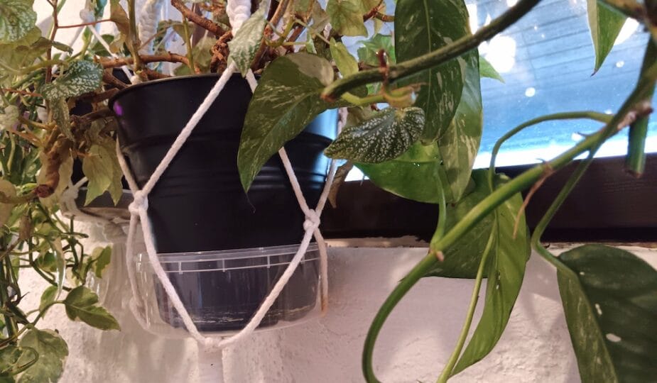 Toinen ongelma on ollut kastelu. Kasvit on istutettu Elhon mustiin Green Basic muoviruukkuihin ja aluslautasena on ollut tavallinen matala kakkulautanen. Tästä syystä kasteluveden annostelu on ollut hankalaa, kun liika vesi valuu lautaselta kastelijan päälle ja lattialle. Tämä taas on aiheuttanut kasteluvarovaisuutta, kun annan kasveille vettä vain pienen lirun kerrallaan. Tämän takia taas kasvit ovat kärsineet ajoittain kuivuudesta. Pari kultaköynnöstä onkin kuivuuttaan hieman kaljuuntunut.