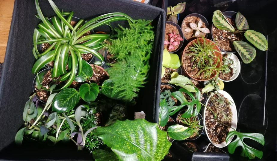 Pakkasin kasvit laatikoihin ja suojasin ne automatkan ajaksi pakkaspeitteellä, vaikka ilma olikin melko lämmin. Edellisiltana olin kastellut kasvit. Kasvien alle vein muovin, jotta mahdollinen ruukuista tuleva kosteus ei tuhoisi kirpputoripöytää. Ajattelin ottaa viikon päästä mukaani pari vesipulloa, joilla voin kastella kasvit, jotta ne eivät pääse liiaksi kuivumaan kahden viikon aikana. Kaikki kasvit olen istuttanut mullattomiin kasvupohjiin.