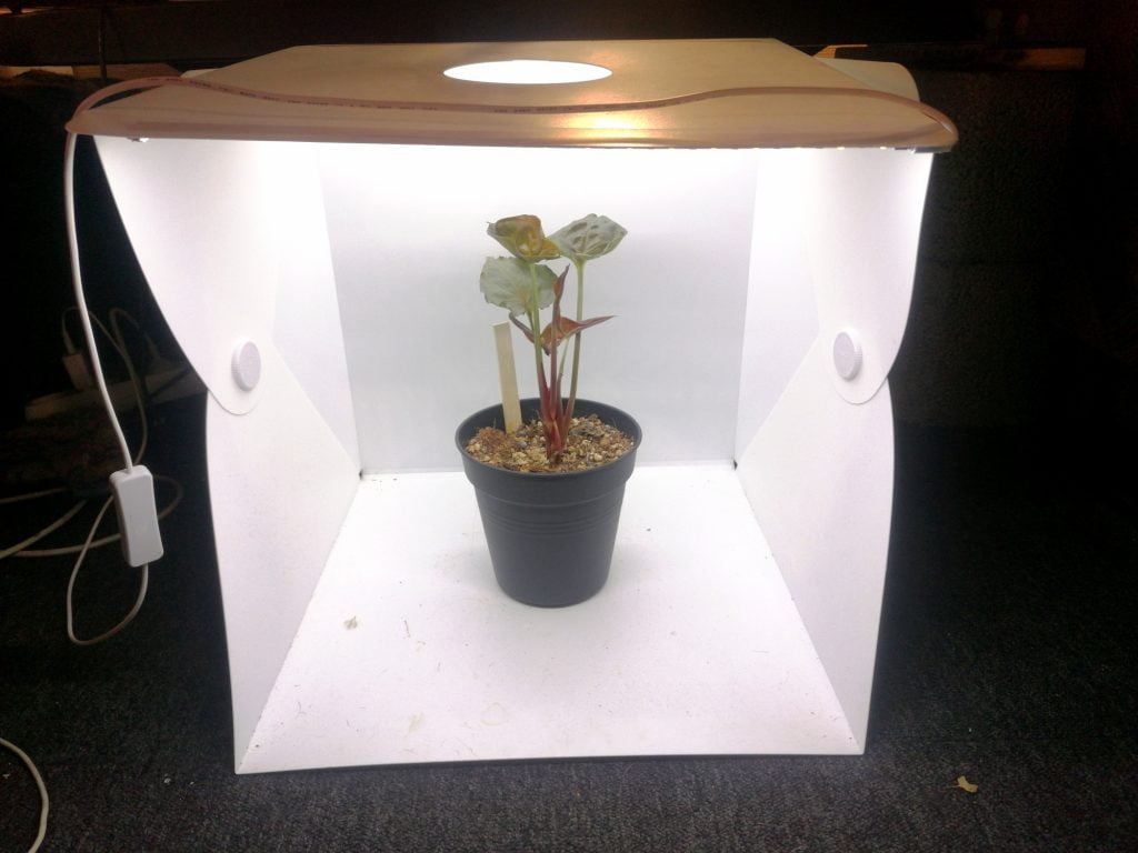 Minulla on valkoinen 50cm x 50cm x 50cm yhdeltä sivulta auki oleva valokuvauslaatikko, jossa on ledvalot. Laatikossa kasvien kuvaaminen on helppoa. Ei tarvitse miettiä kuvan taustaa ja muita muuttujia. Laatikossa on helppo ja nopea kuvata pieniä kasveja, mutta isot kasvit eivät laatikkoon mahdu. Laatikossa on hyvä valaistus ja tausta on valkoinen, mikä korostaa kasvin värejä.
