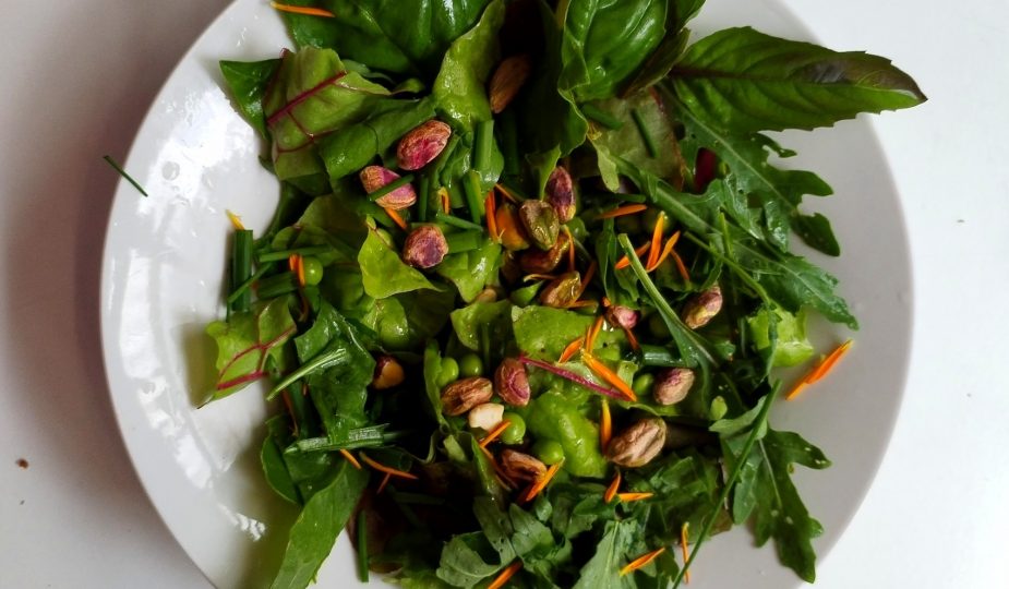 Valmistin salaatin tummista ja vihreistä salaatinlehdista, mangoldista, rukolasta, ruohosipulista, basilikoista, herneenversoista ja herneistä sekä kehäkukan terälehdistä. Lisäksi ripottelin pinnalle kuorittuja pistaasipähkinöitä, suolaa ja mustapippuria. Höystin salaatin lirauksella oliiviöljyä.