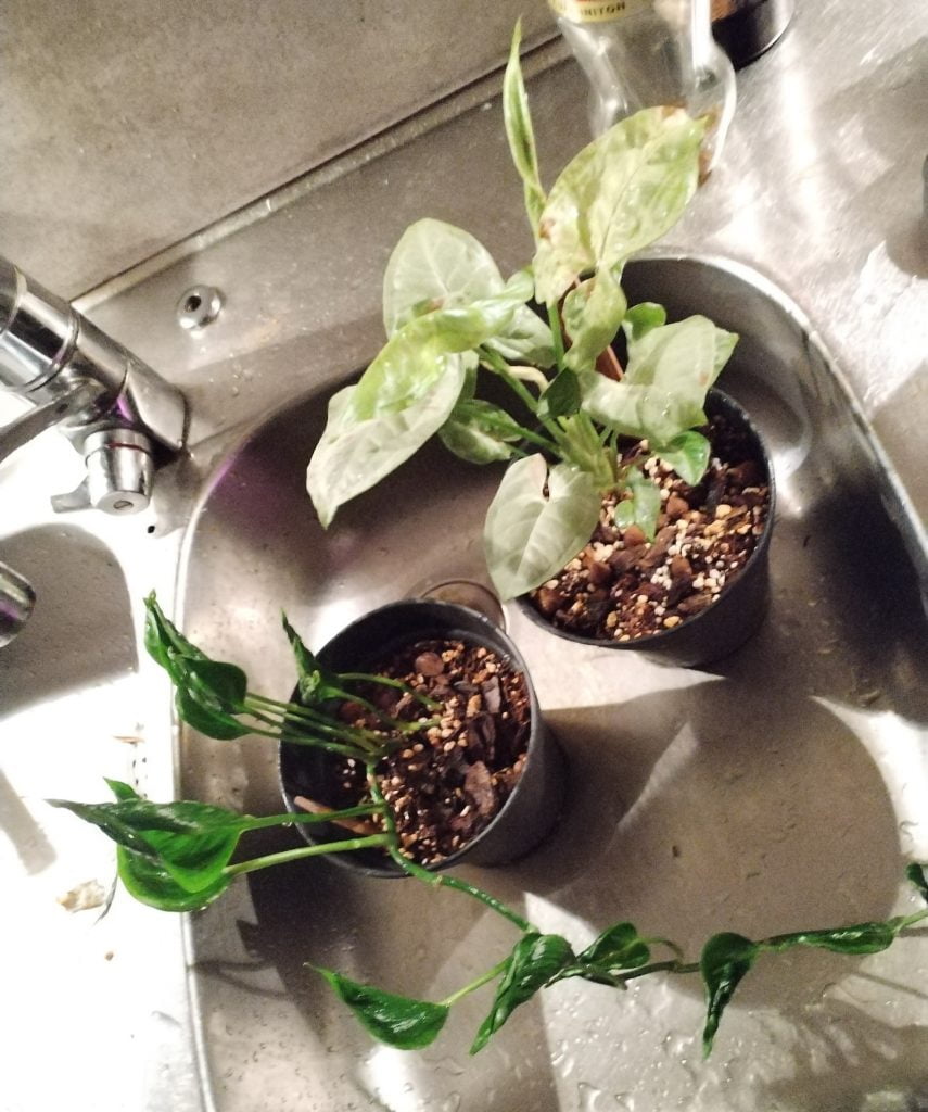 Isommat kasvit kuljetin kylpyhuoneeseen ja pienemmät pesin keittiön lavuaarissa. Avukseni otin muovisen laatikon, jolla sain vietyä kylpyhuoneeseen 6-8 kasvia kerrallaan. Laatikko nopeutti jonkin verran kasvien siirtelyä. Suihkussa laskettelin kädenlämpöistä vettä pienimmällä mahdollisella paineella. Joitain kasveja jouduin kannattelemaan pystyssä suihkun aikana, sillä veden paine ja paino lehdillä taivuttaa helposti kasvia. Taipuisimmat laitoin nojaamaan seiniä vasten ennen suihkua.