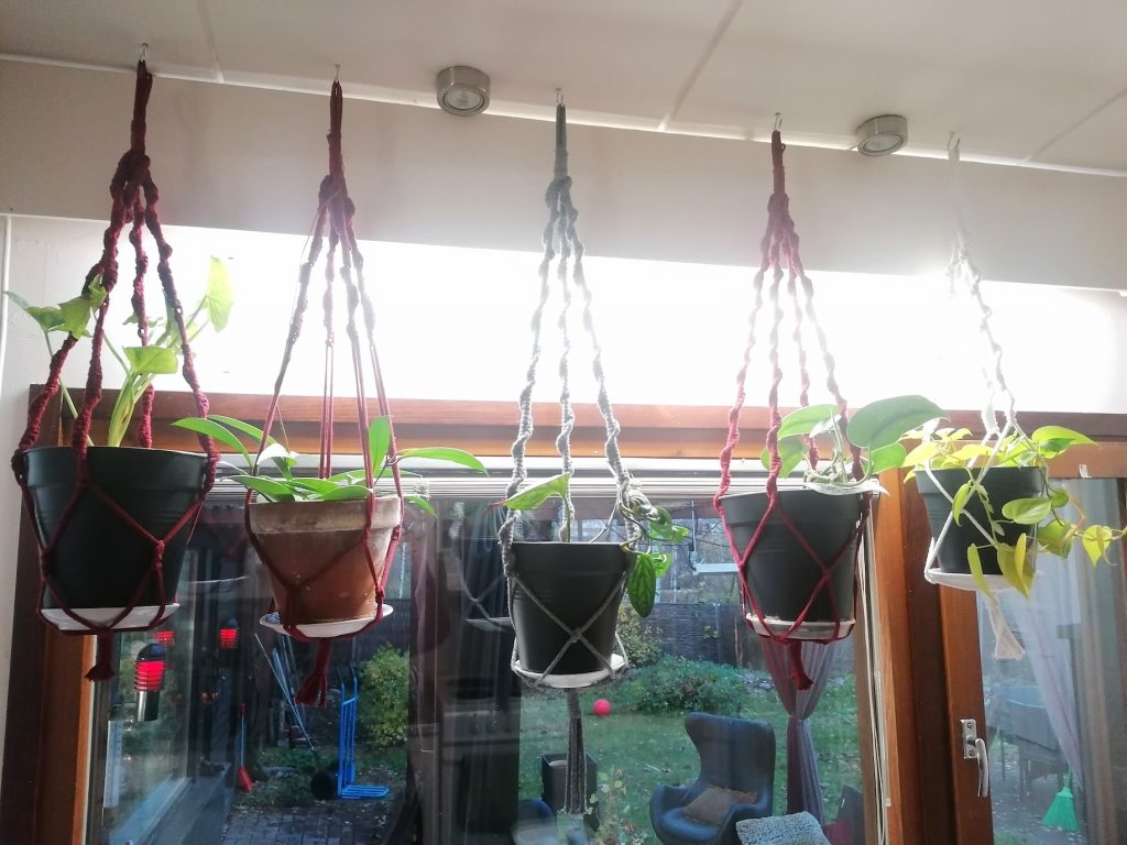 Keittiön pohjoisikkunalla amppelit ovat niin korkealla, että luonnonvaloa ei niihin liiemmin osu. Kasveilla onkin ympäri vuoden kasvivalot, jotka olen piilottanut verholaudan taakse. Valoa annan 12 tuntia päivässä. Viittä amppelia valaisee pitkä 24W ledilista, jonka olen saanut koekäyttööni Vplux Oy:ltä