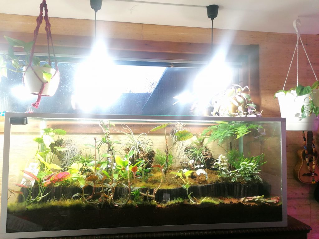 Ainoa länsi-ikkunamme on pieni ja sen alapuolella on kasviterraario. Kesällä terra saa ikkunasta hyvin valoa, kun aurinko on korkealla. Syyskuusta alkaen valoa kuitenkin on tullut ikkunasta jo paljon vähemmän ja laitoin terraarion lisävalot päälle. Lamppuina on Airamin 4000K 16,5W polttimot E27 kannalla. Lampuissa on hyvin valoa heijastavat varjostimet (Valkoinen kiiltävä maali sisäpinnalla.) Ikkunalla olevat amppelit eivät lisävaloa saa kuin latvoihin, sillä ne saavat valoa melko hyvin ikkunastakin. Lamput ovat ajastimen päässä ja saavat valoa 12 tuntia vuorokaudessa.