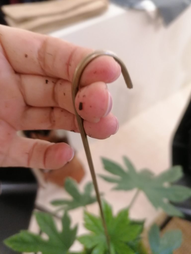 Lopuksi kasville laitettiin koukku. Noin 60cm pitkän messinkitangon alapäähän tehtiin pihdeillä koukku. Tanko vedettiin keskeltä palloa, alhaalta ylös pallon läpi, jolloin koukku tarrasi pallon pohjaan kiinni ja esti tangon läpimenon pallosta. Kun tanko oli paikoillaan, tehtiin tangon yläpäähän pihdeillä vielä ripustuskoukku ja kokedama oli valmis.