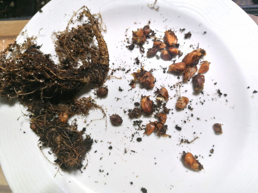 Sain jakopuuhassa lähes kaikki lehdet katkeamaan ja irtoamaan juurimukuloistaan, joten päädyin istuttamaan mukuloihin kiinni jääneet kolme lehtinippua toiseen ruukkuun ja irronneet juurimukulat istutin toiseen, hieman isompaan ruukkuun. Laitoin irti toisistaan otetut mukulat noin parin sentin väleillä parin sentin syvyyteen kasvupohjaan.