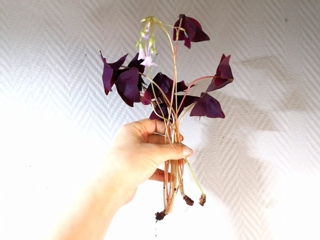 Paras ja helpoin hetki kolmiokäenkaalin jakamiseen on aikainen kevät lepokauden lopussa. Silloin kasvupohjassa olevat mukulat kaivetaan ylös, irrotetaan toisistaan ja istutetaan uudestaan. Koska omani saa keinovaloa, ajattelin jakaa kasvin nyt, vaikka onkin marraskuu, sillä kasvin lehdet elelivät ahtaan oloisesti tiiviinä nippuna.
